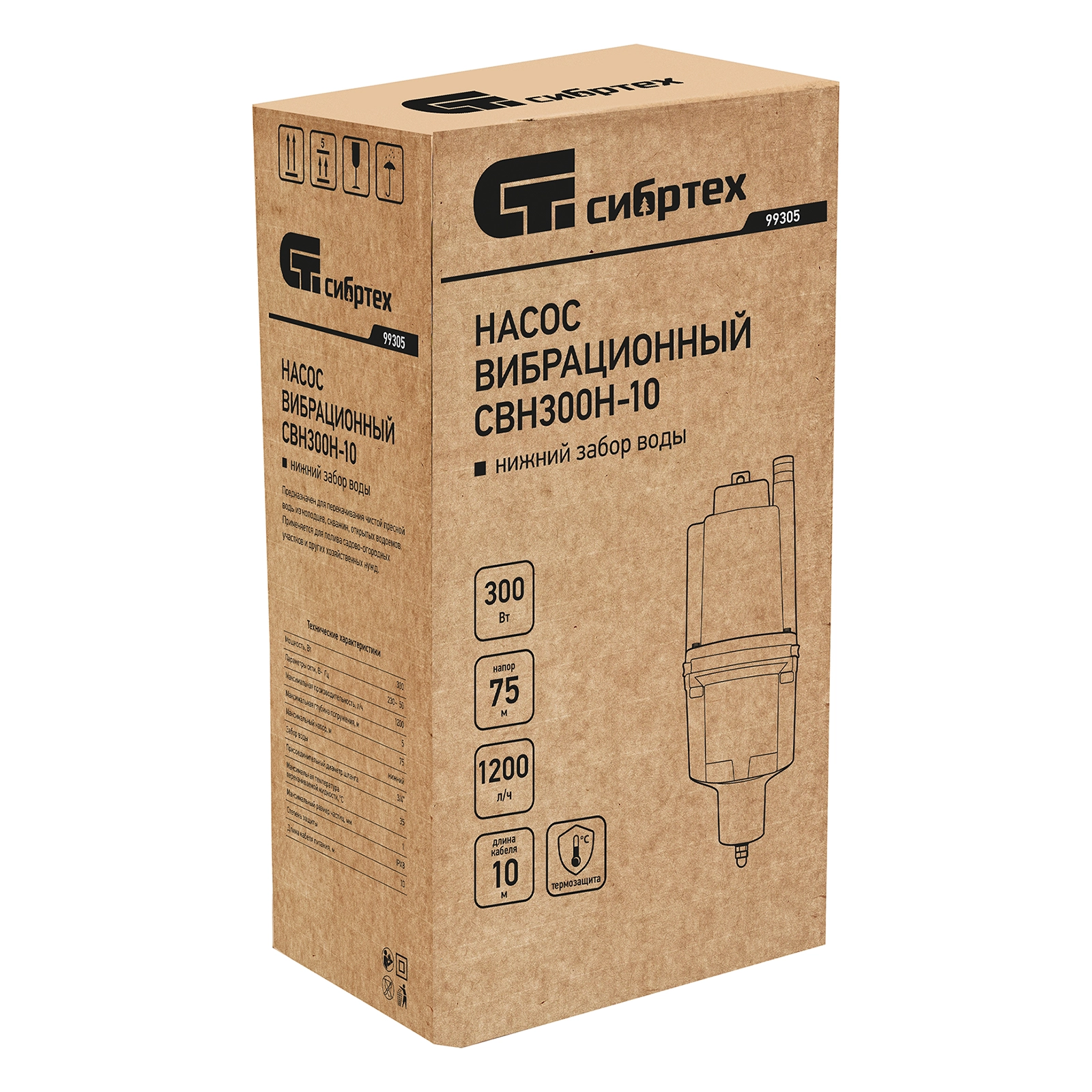 ПроизводителиНасос вибрационный СВН300Н-10, нижний забор, 300 Вт, напор 75 м, 1200 л/ч, кабель 10 м Сибртех