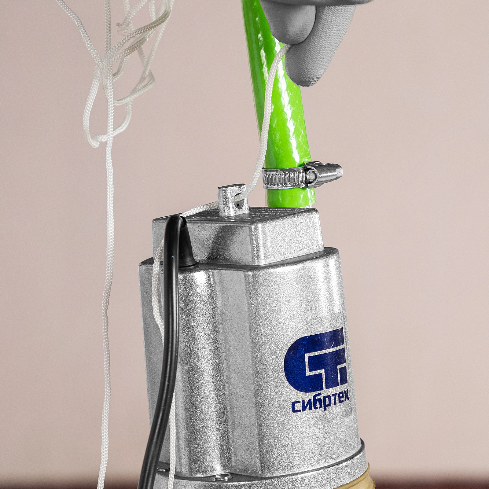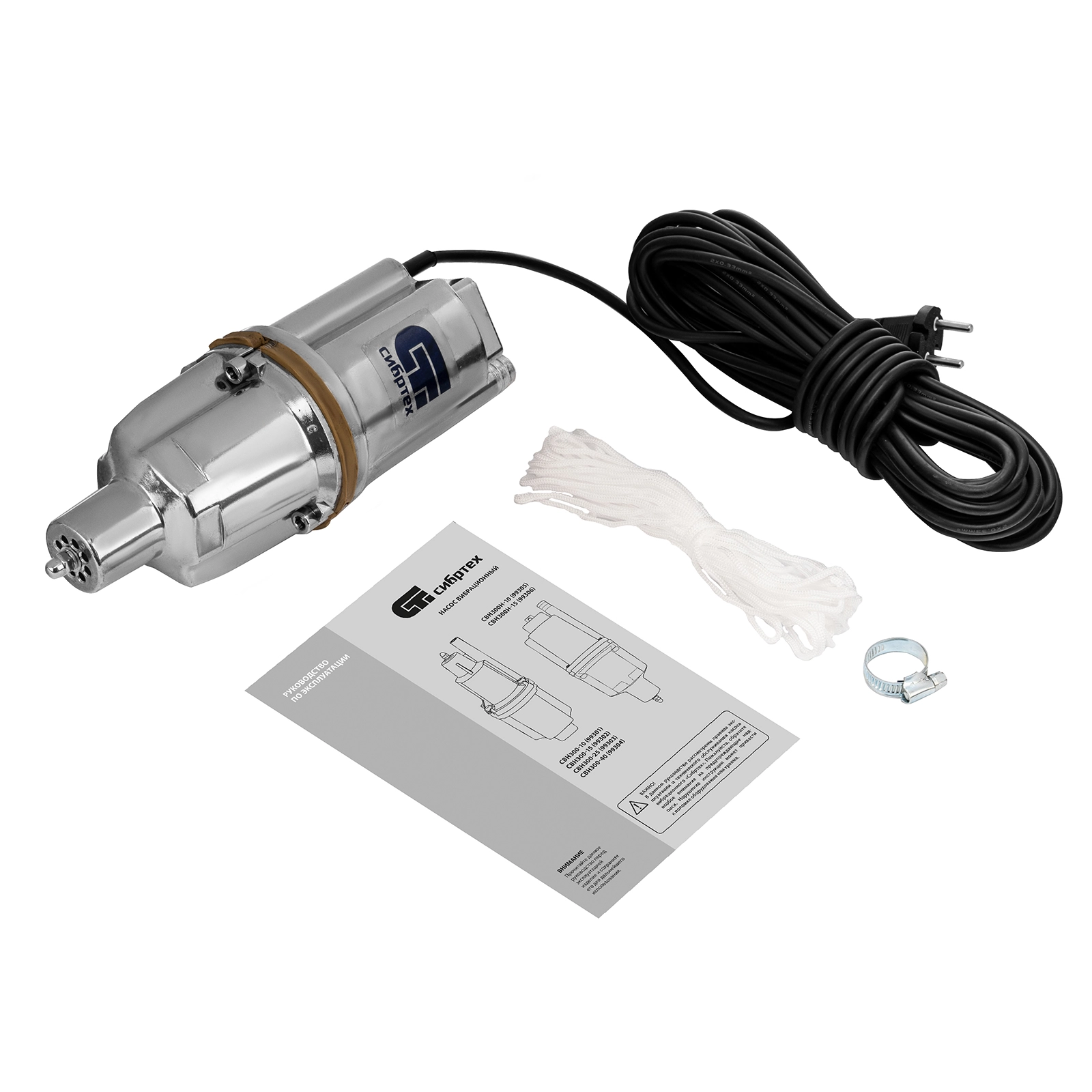 - Необходимые аксессуары в комплекте — трос для установки и хомут для подключения шланга прилагаются к насосу.