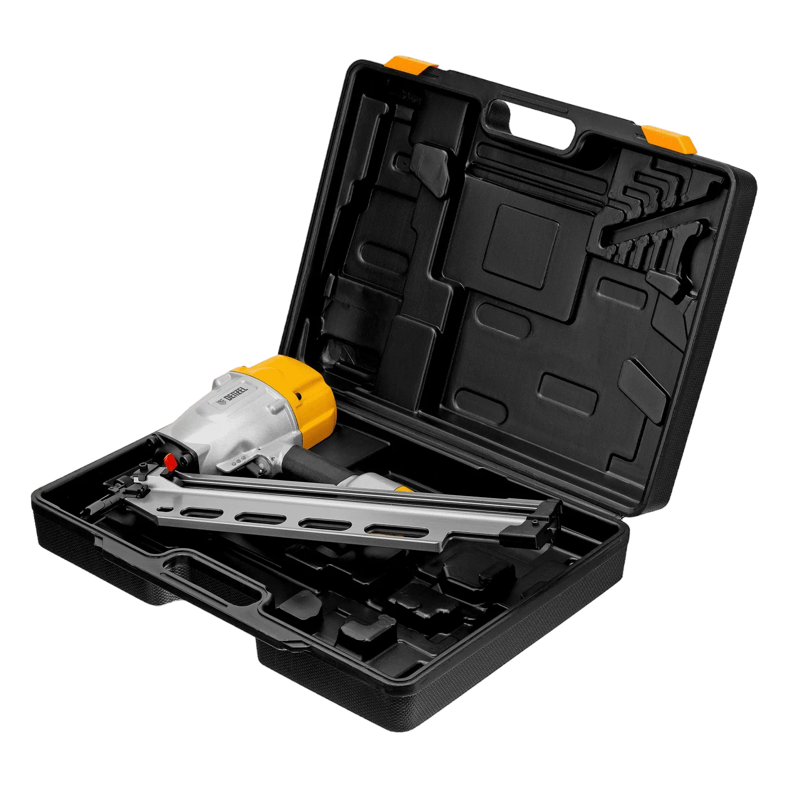 - Удобное хранение и транспортировка — нейлер поставляется в прочном пластиковом кейсе.
