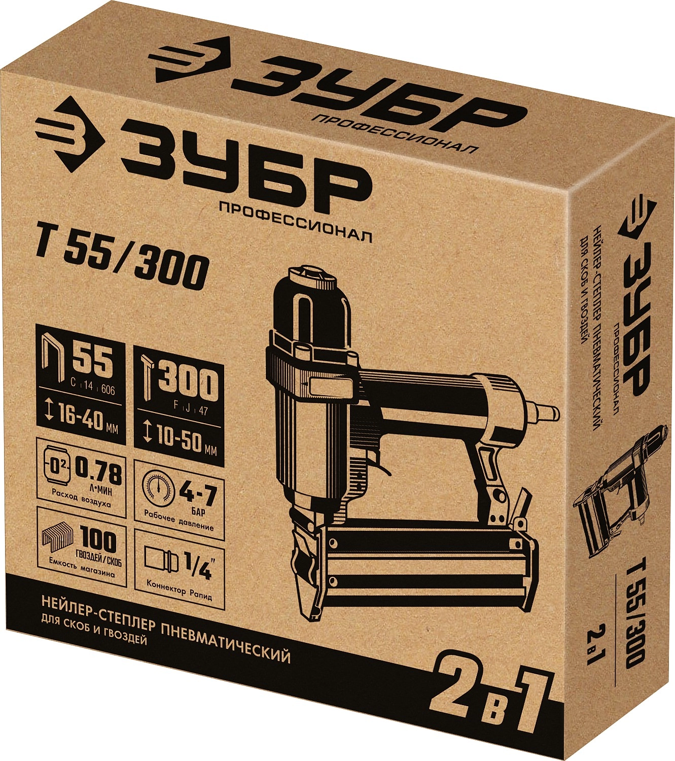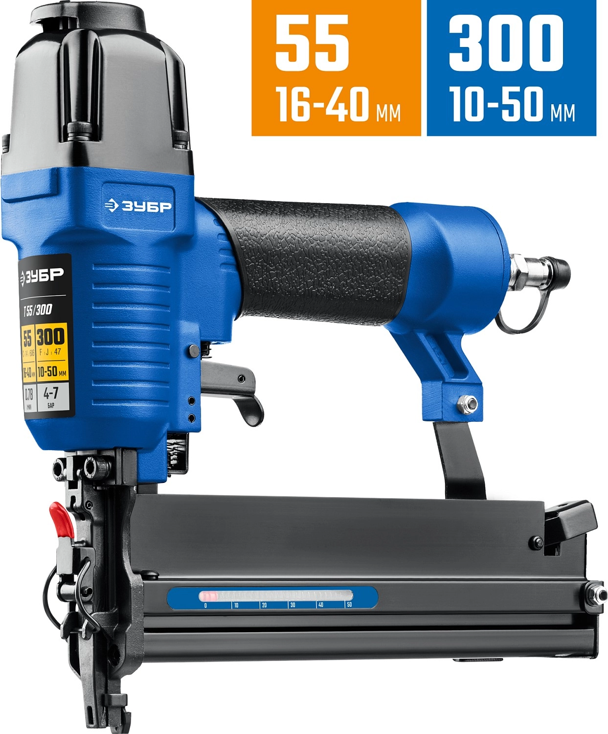 ПроизводителиНейлер-степлер (гвозде/скобозабиватель) пневм., 13-40мм, 10-50мм, тип скоб 55/300 (31937) ЗУБР