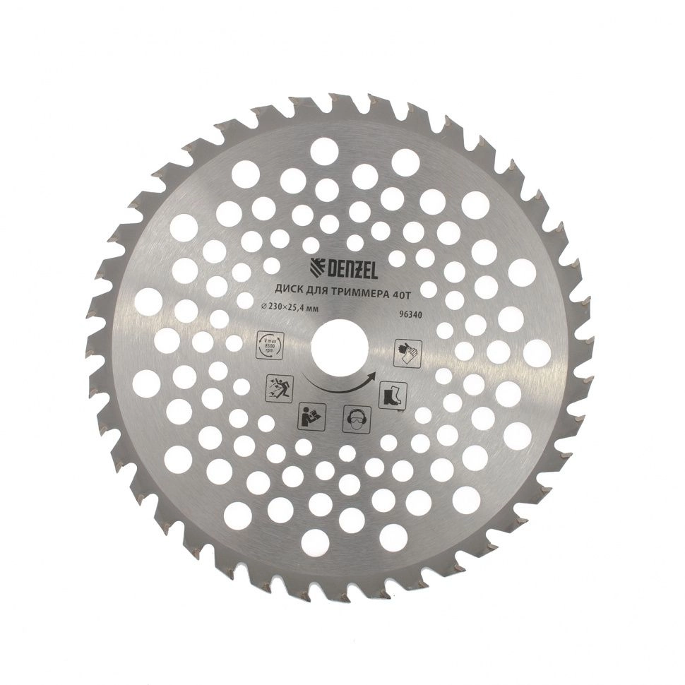 Диск для триммера Denzel 96340 внешним диаметром 230 мм и внутренним — 25,4 мм, толщиной 1,3 мм, с 40 зубьями, совместим со всеми бензотриммерами Denzel и Сибртех, а также электротриммерами Denzel 96611 и 96612. Он используется для скашивания травы, подпиливания веток кустарника и молодых деревьев.Производитель: ООО "Мир инструмента", Россия