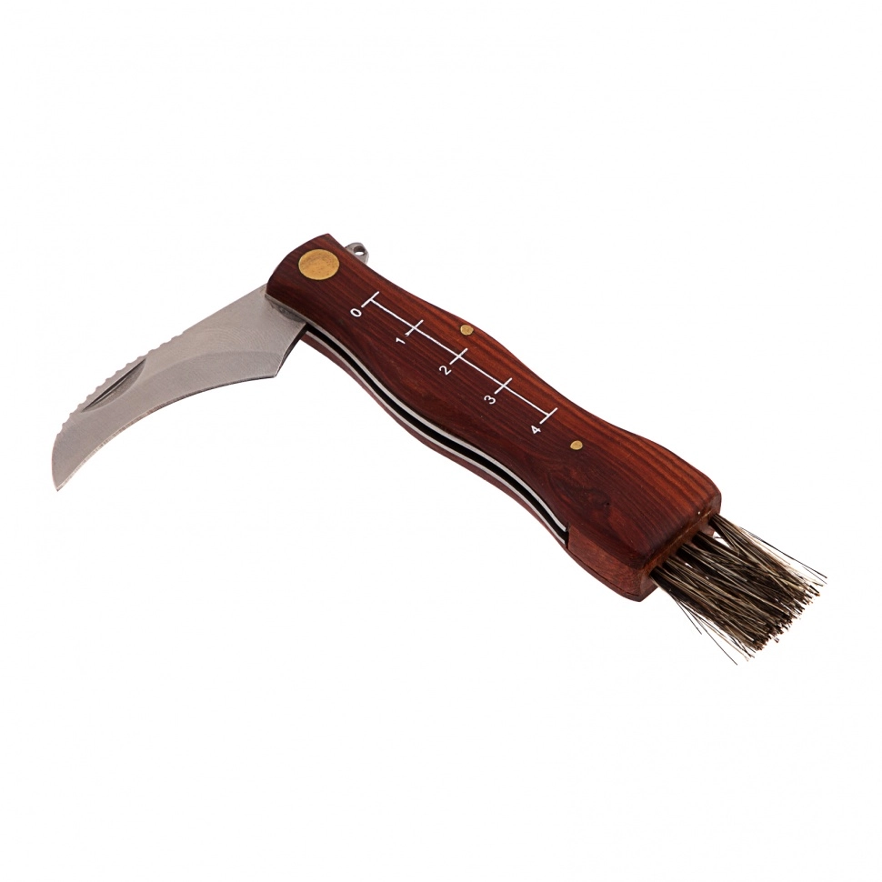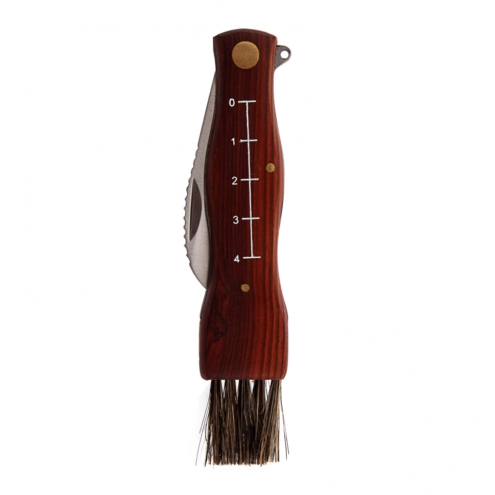 Нож оснащен кисточкой из натуральной щетины для очищения шляпок грибов от мелких листьев, хвои и другого мусора.