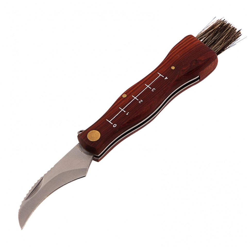 Нож оснащен кисточкой из натуральной щетины для очищения шляпок грибов от мелких листьев, хвои и другого мусора.