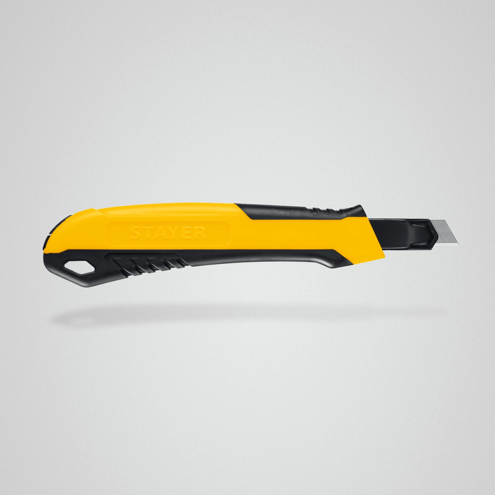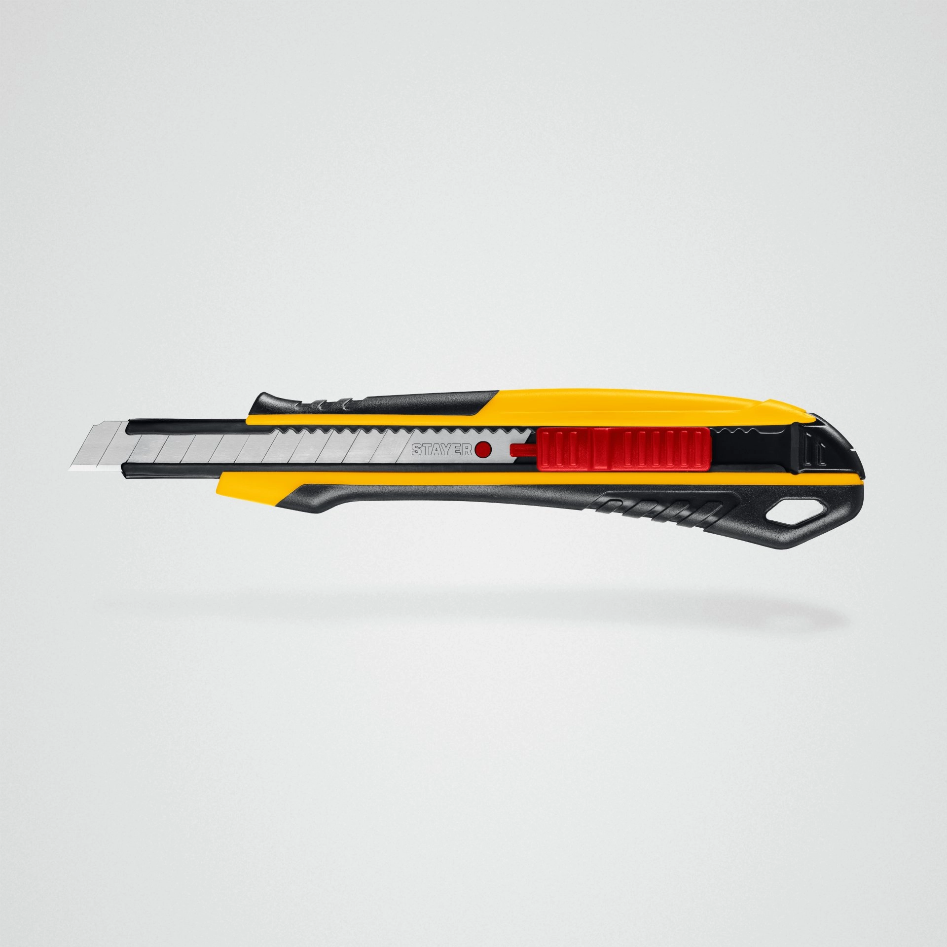 Нож с лезвием STAYER 0903_z01, применяется для эффективного разрезания различных материалов: линолеума, ковровых покрытий, гипсолитовых плит, гипсокартона, кровельных материалов, пластика, дерева.Производитель: Крафтул И/Е Гмбх, Альтер Поствег Штр., Лоенинген, Германия