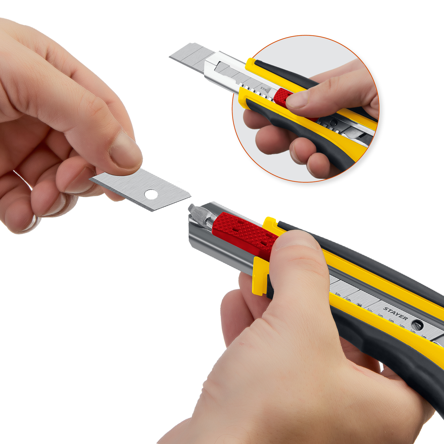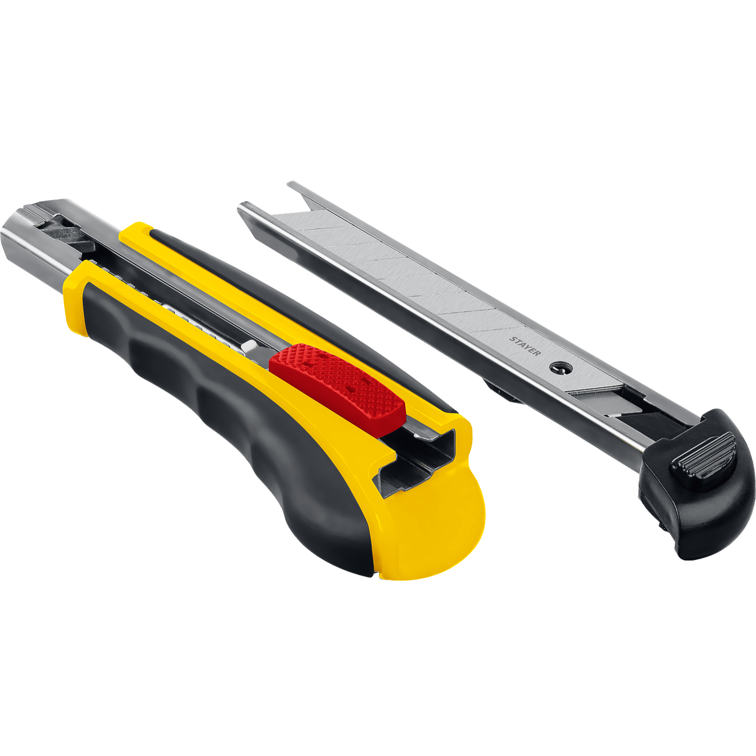 ПроизводителиНож с автозаменой и автостопом с доп. фиксатором HERCULES-18, 3 сегмент. лезвия 18 мм, STAYER