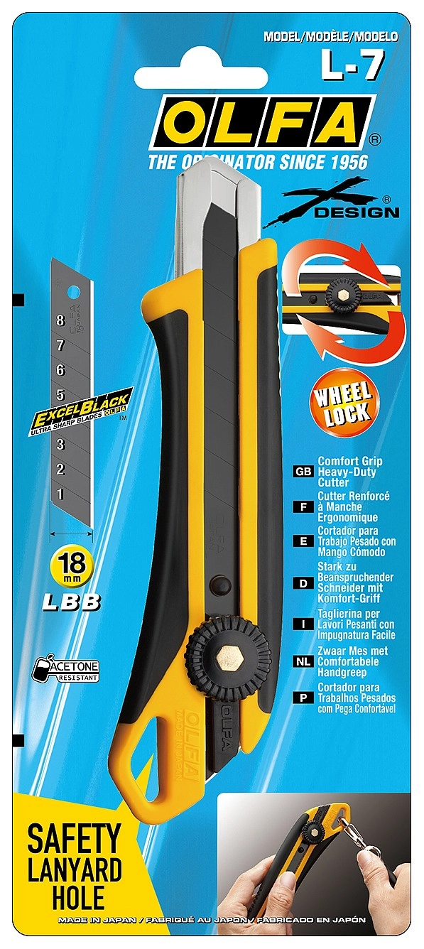 Универсальный нож OLFA L-7 серии X-design ComfortGrip с храповым механизмом и металлическим выступом. Легкий и простой в использовании оснащен эргономичной противоскользящей рукояткой устойчивой к кислотам, ацетону и маслам, усиленной фиберглассом. Эта комбинация обеспечивает удобный, надежный захват при выполнении самых сложных работ. Поставляется с черным лезвием LBB шириной 18 мм, которое на 25% острее стандартных лезвий OLFA. Просто отломите один из восьми сегментов, если лезвие затупилось. Полная замена происходит быстро и без дополнительных инструментов.Производитель: Крафтул И/Е Гмбх, Альтер Поствег Штр., Лоенинген, Германия