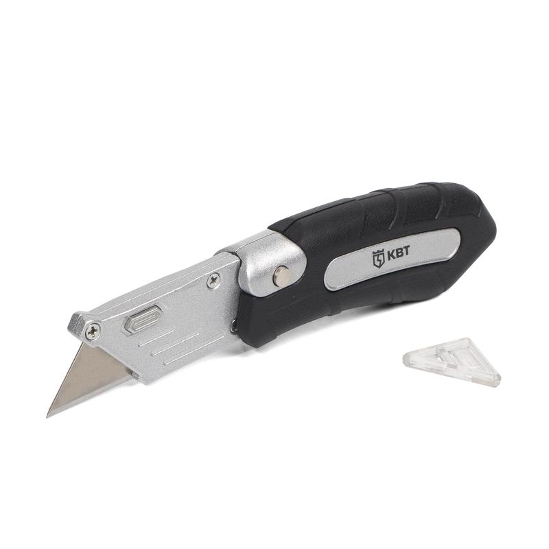 Нож строительный монтажный складной НСМ-20, КВТ 79899 — нож складной с трапециевидным лезвием предназначен для разрезания тонких строительных материалов (бумага, картон, пластик, резина и т.д.) Автоматическая фиксация в раскрытом состоянии и под углом 90°. Металлический корпус из легкого сплава с прорезиненной рукояткой обеспечивают комфортную и безопасную работу