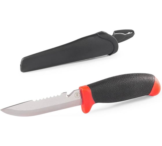 Конструкция: с фиксированным лезвием Материал лезвия: нержавеющая сталь Толщина обуха: 2,5 мм Длина лезвия: 100 мм Форма клинка: Clip-Point с серрейторной заточкой и стропорезом на обухе Рукоятка двухкомпонентная удобной формы с покрытием из резины Пластиковые ножны/чехол обеспечивают безопасное хранение и позволяют размещать нож на ремне.