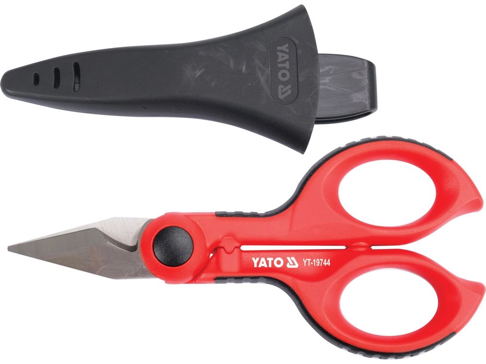 Ножницы для электриков с лезвиями, позволяющими резать электрические провода кабельного типа сечением до 10 мм2. Они имеют двухкомпонентные чехлы на ручки. Более твердый компонент из полипропилена, установленный непосредственно на инструменте, плотно прилегает к корпусу. Внешняя часть изготовлена из противоскользящего TPR и приятна на ощупь. Большая, массивная соединительная заклепка предотвращает расхождение режущих кромок вбок. В комплект входит удобная пластиковая кобура, которую можно прикрепить, например, к ремню брюк или надеть в карман.