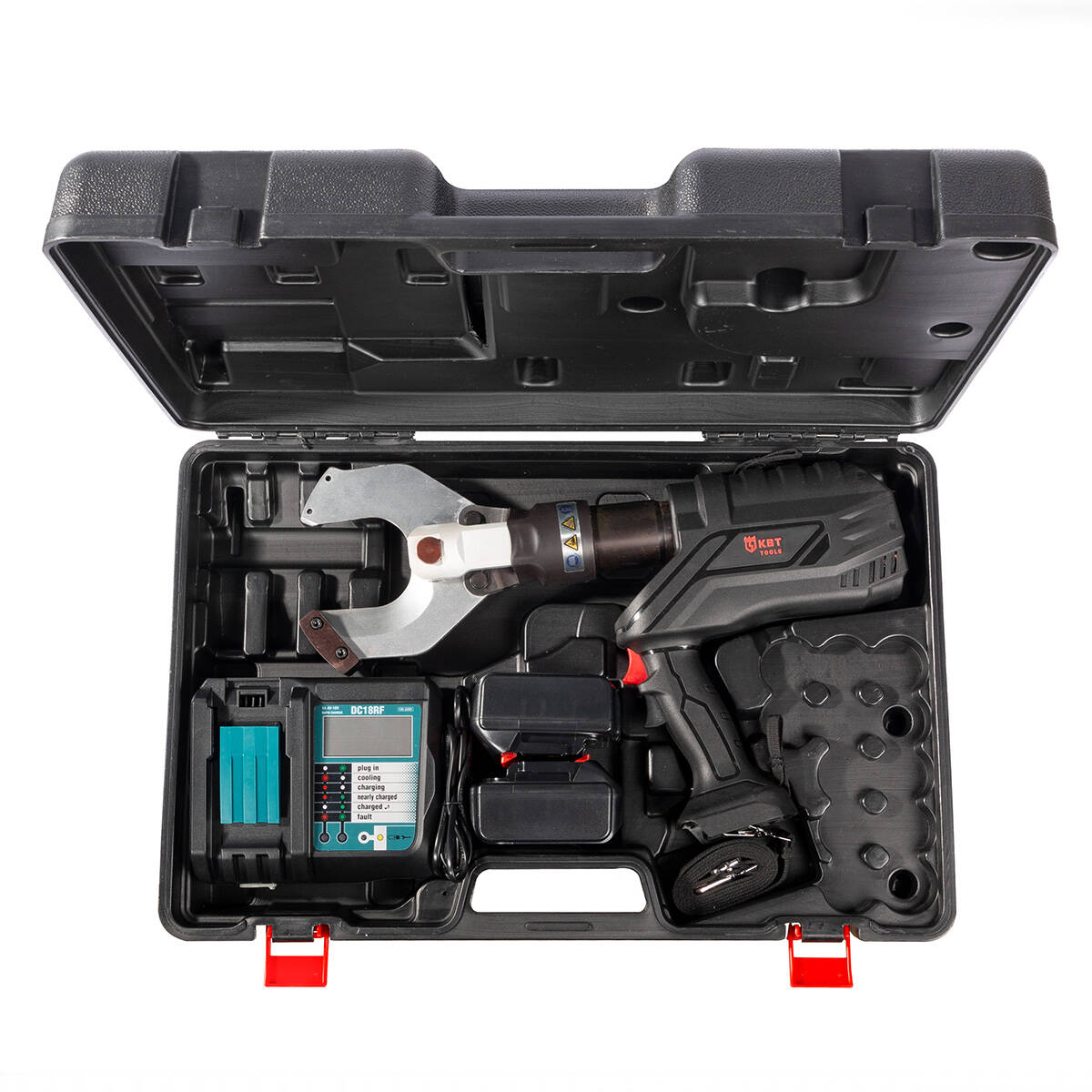 Идеальны для резки магистральных высоковольтных кабелей из сшитого полиэтилена Резка кабеля в труднодоступных местах Механизм автоматического сброса давления (АСД) Кнопка ручного сброса давления Открытый тип ножниц Функция экономии энергии Светодиод для подстветки рабочей зоны Светодиод-индикатор заряда батареи Максимальное усилие: 6.5 т Время резки: 6–8 сек. Время зарядки аккумулятора: 120 мин. Вес аккумулятора: 0.60 кг Вес комплекта/инструмента: 11.60/6.60 кг Длина: 500 мм Габариты кейса: 600x400x130 мм Характеристики