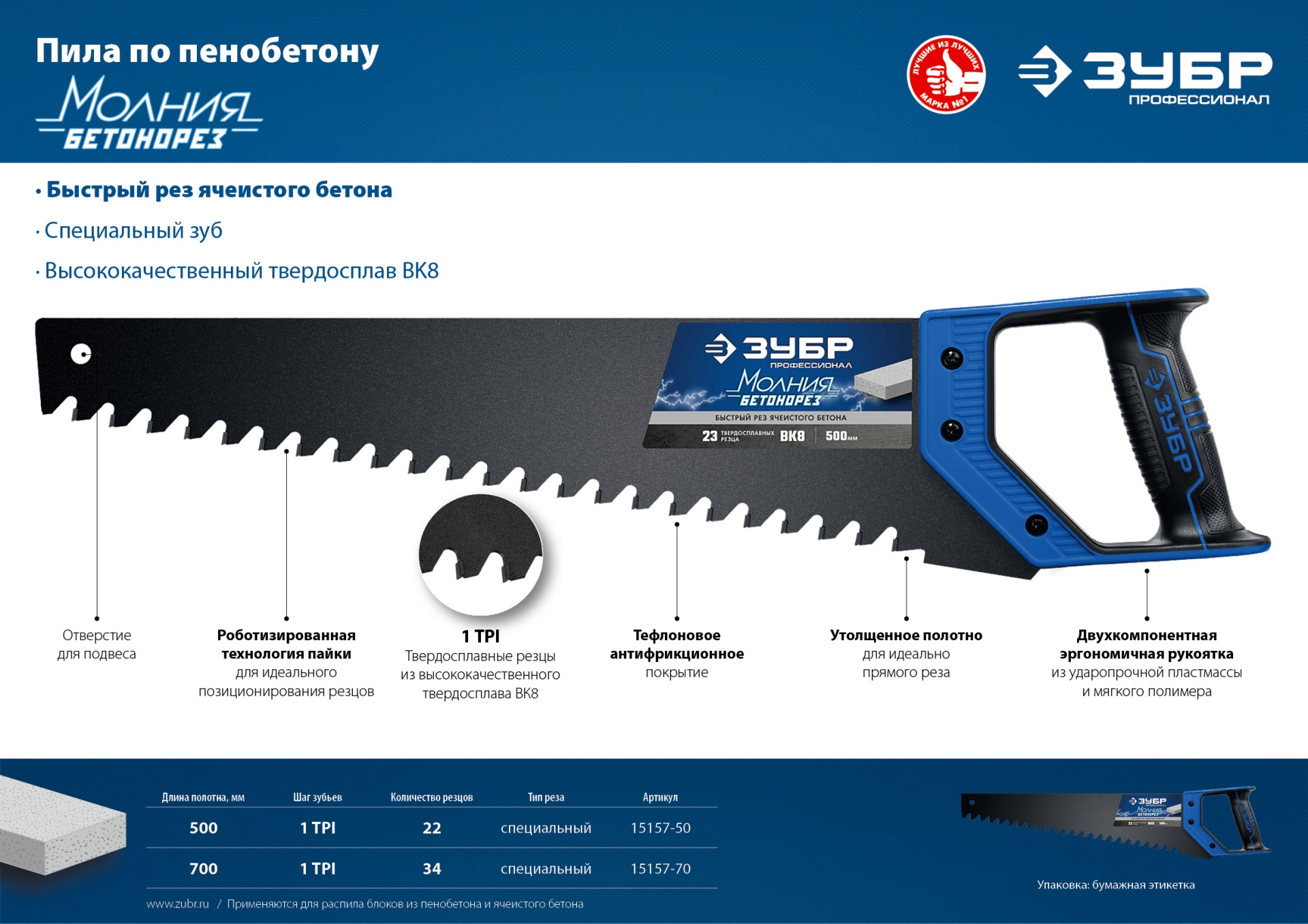 ПроизводителиНожовка для пено(газо)бетона L=700мм, 32 тв.спл.зуб. (15157-70) ЗУБР