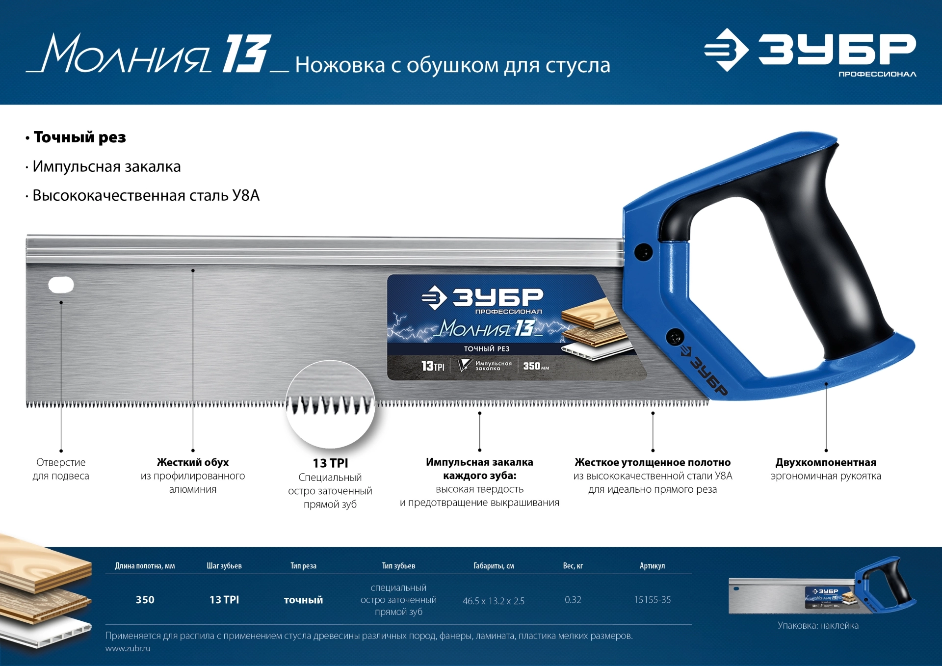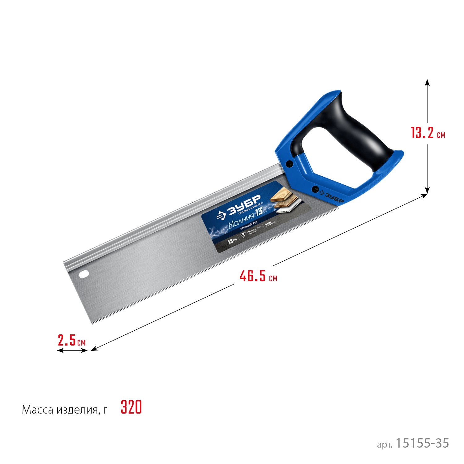 ПроизводителиНожовка с обушком для стусла (пила) "МОЛНИЯ 13" 35 х 11 см, 13 TPI, точный рез, (15155-35_z01) ЗУБР