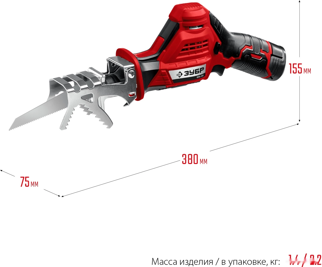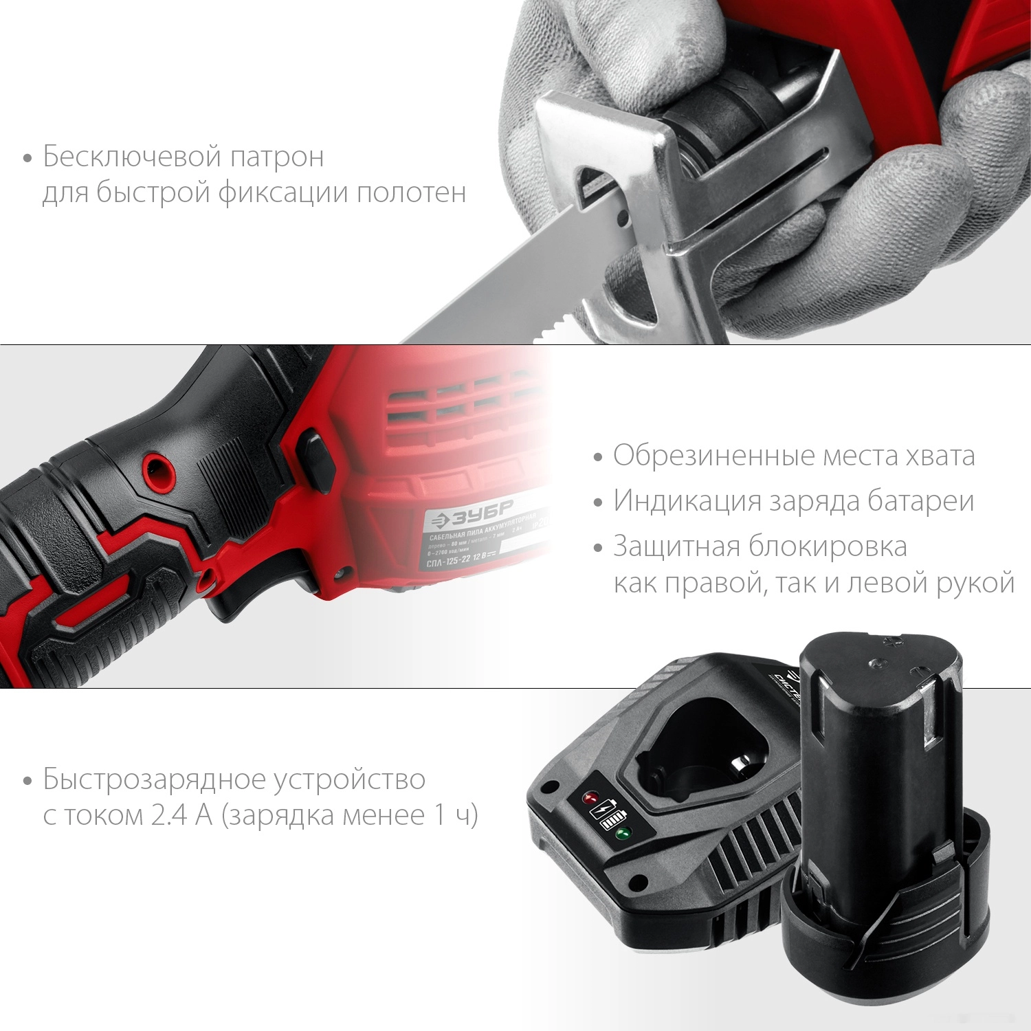ПроизводителиНожовка сабельная аккум. СПЛ-125-22 (12.0 Вт,2аккум. х 2.0А/ч, дер.до 80 мм, мет.до 7 мм, кор.) ЗУБР