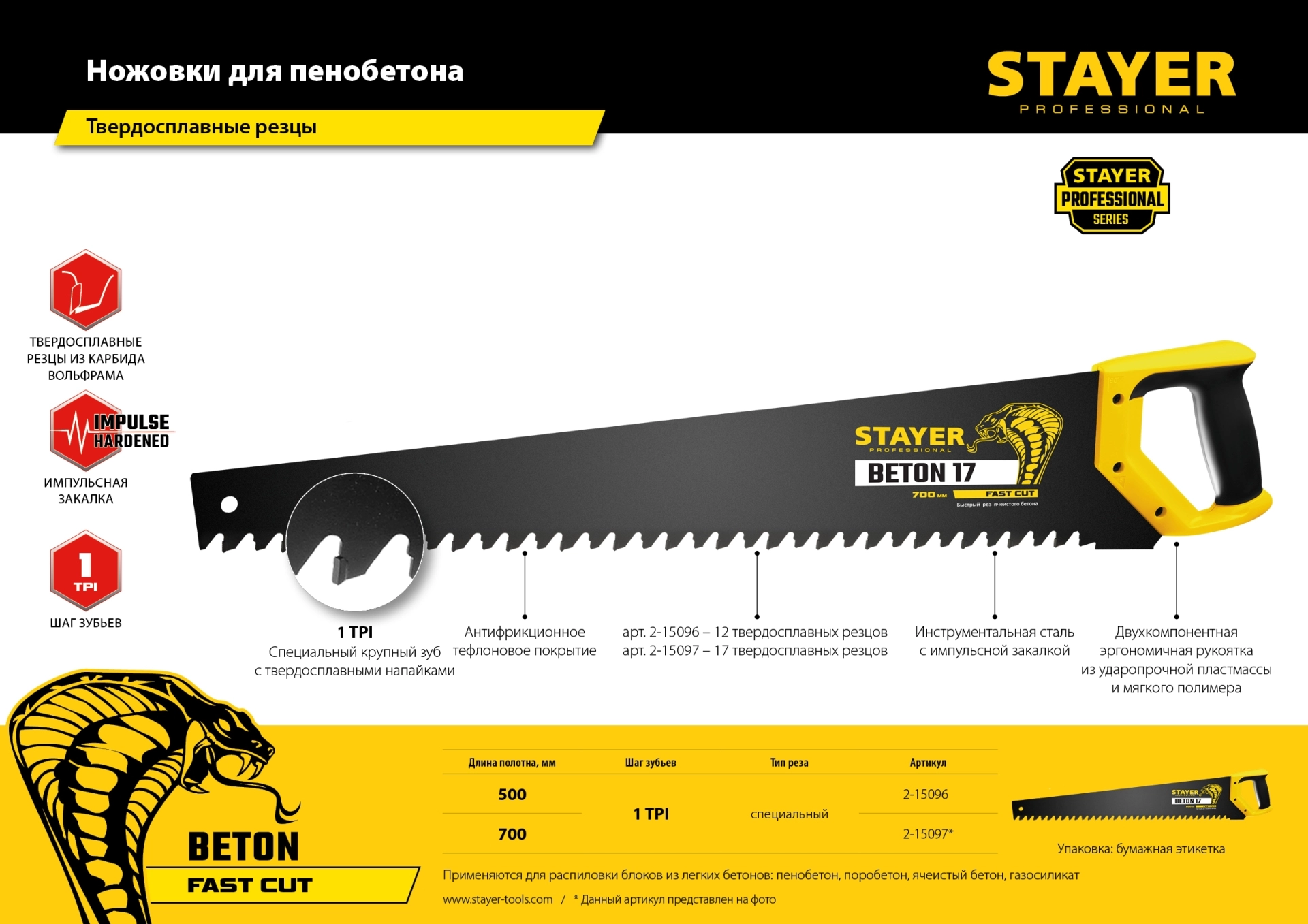 ПроизводителиНожовка для пено(газо)бетона L=500мм, 12 тв.спл.зуб. "Beton Cut" (2-15096) STAYER