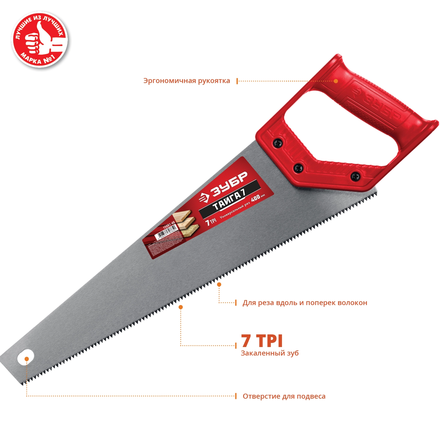 ПроизводителиНожовка универсальная (пила) "ТАЙГА-7" 400мм,7TPI, закаленный зуб, рез вдоль и поперек волокон, для