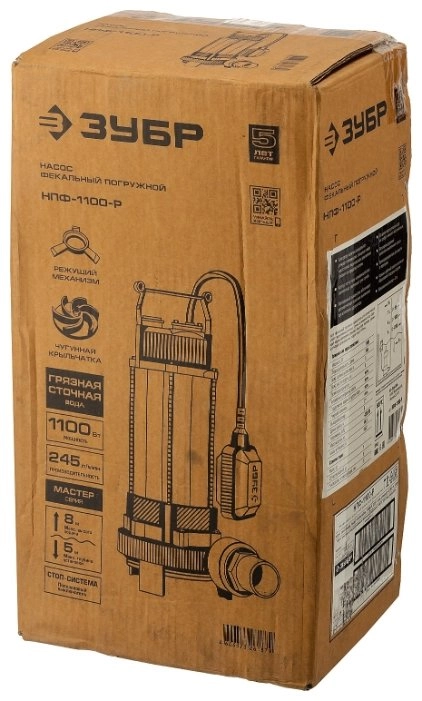 ХарактеристикиАртикул НПФ-1100-РБренды ЗубрСтрана производства КитайТип фекальныйПотребляемая мощность 1100Цвет красный/серебристыйМатериал корпуса чугунПроизводительность 14.7Напряжение 220Глубина погружения 5Длина сетевого шнура 5Защита от перегрева ДаВес 14.5Максимальный напор 15Метод установки погружнойФорма вертикальныйНапор 8Длина 260Ширина 210Высота 480Диаметр разъема соединения 1Длина кабеля 5Качество воды грязнаяМеханизм насоса центробежныйЗащита от сухого хода ДаТип погружного насоса фекальныйПлавный пуск двигателя НетПовышение давления НетРежущая насадка ДаМаксимальная температура воды 35Тип выключателя поплавковыйТип насоса электрическийРучка для переноски ДаОписание товара обновлено 08.12.2025 15:17:28Автоматическое поддержание давления, термопредохранитель для защиты двигателя, высокие эксплуатационными свойства и простая конструкция обеспечивают эффективное, надёжное и безопасное применение данных насосов для откачки грязной воды, сточных и бытовых вод на приусадебных и дачных хозяйствах.