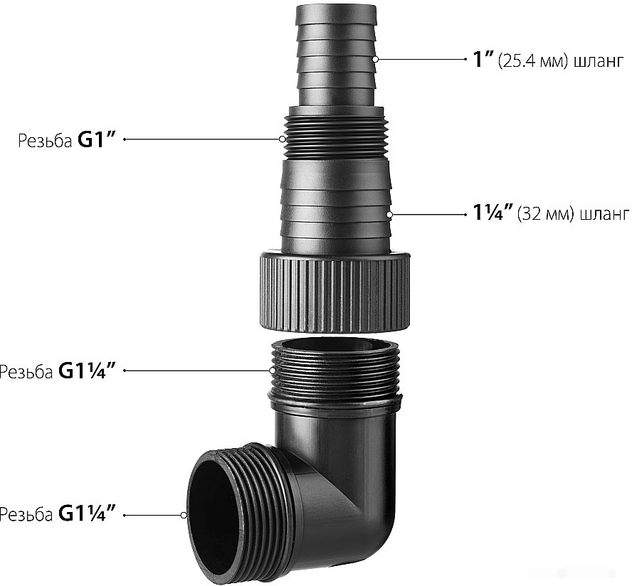 - Универсальный соединительный штуцер от 1'' до 1 1/4''.