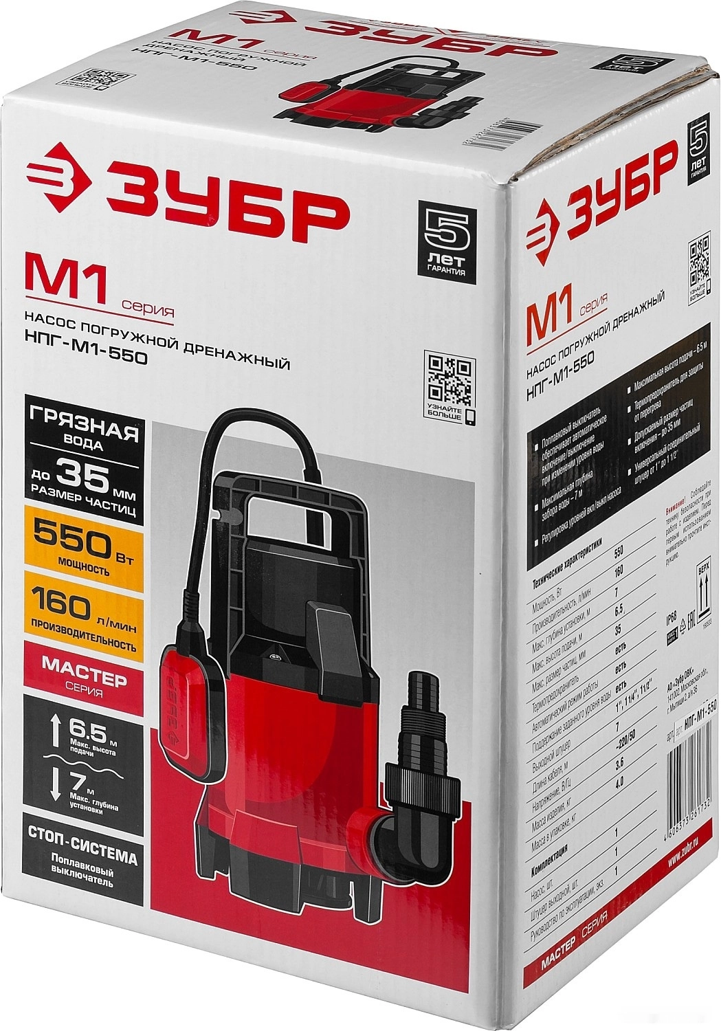 ХарактеристикиАртикул НПГ-М1-550Бренды ЗубрСтрана производства КитайТип дренажныйПотребляемая мощность 550Назначение водоотведениеМатериал корпуса пластикПроизводительность 9.6Напряжение 220Глубина погружения 7Длина сетевого шнура 7Вес 3.6Метод установки погружнойНапор 6.5Размер пропускаемых частиц 35Длина 190Ширина 160Высота 290Длина кабеля 7Качество воды загрязненнаяОписание товара обновлено 08.12.2025 15:16:30Автоматическое включение и выключение, термопредохранитель для защиты двигателя, высокие эксплуатационные свойства и простая конструкция обеспечивают надёжное и безопасное применение для перекачивания чистой и загрязнённой воды на садовых участках, при осушении ёмкостей и водоёмов, организации забора воды с глубины (колодцы, скважины) и подачи на высоту, использовании в системах аэрации и дренажа.