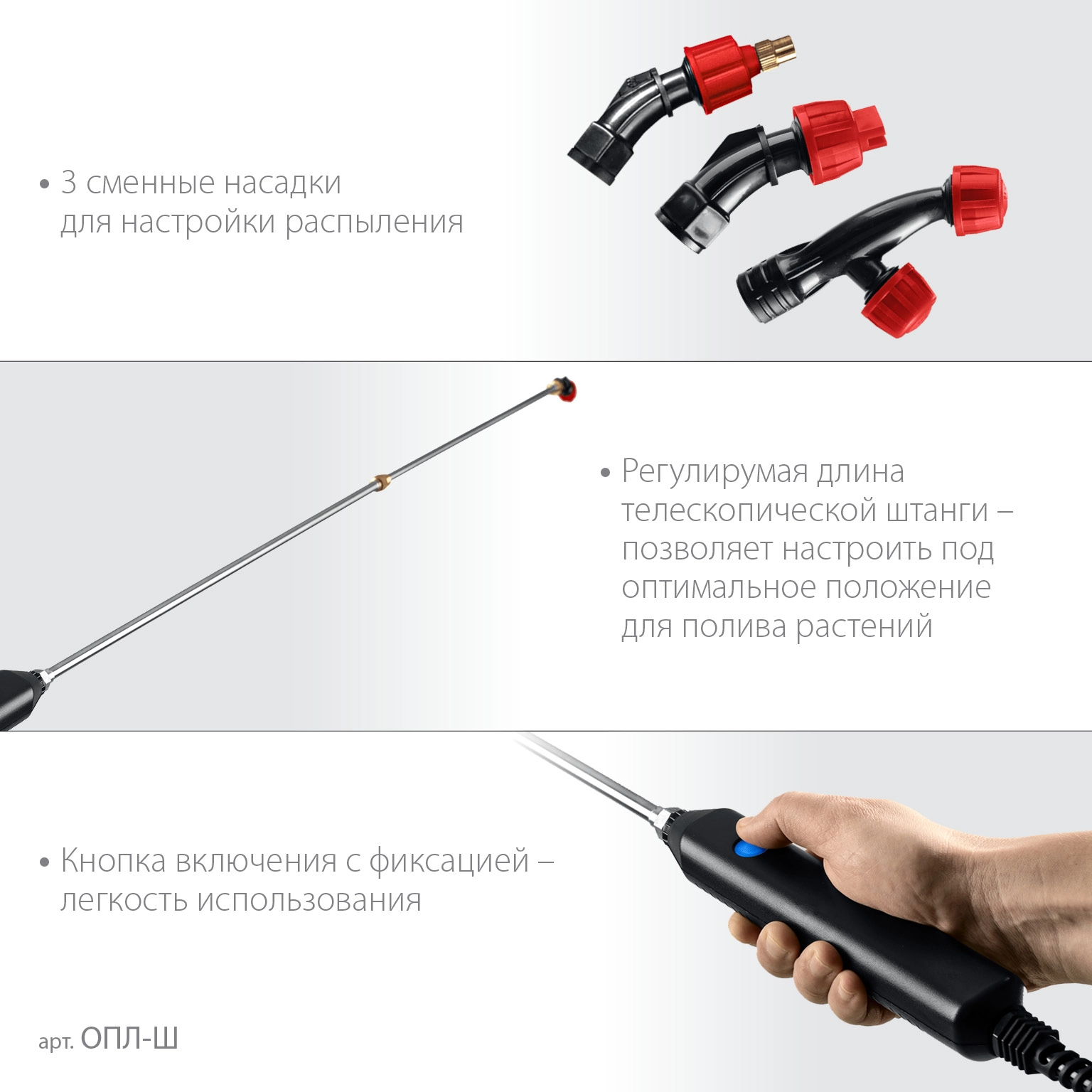 3 сменные форсунки для быстрой настройки формы струи под любые задачи