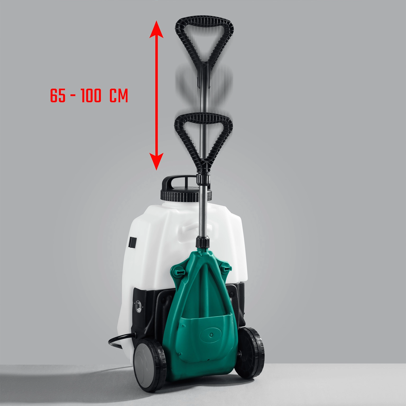 Ранцевый аккумуляторный опрыскиватель отличается эффективностью, мобильностью, экологичностью. Бережно орошает растения. Подходит для дезинфекции помещений и участков, мытья окон и стен, нанесения антисептиков и антипиренов. Работает от свинцово-кислотного аккумулятора. За счет наличия ремней обеспечивается удобство переноски на спине, а за счет тележки с колесами - легкость перемещения к месту проведения работ