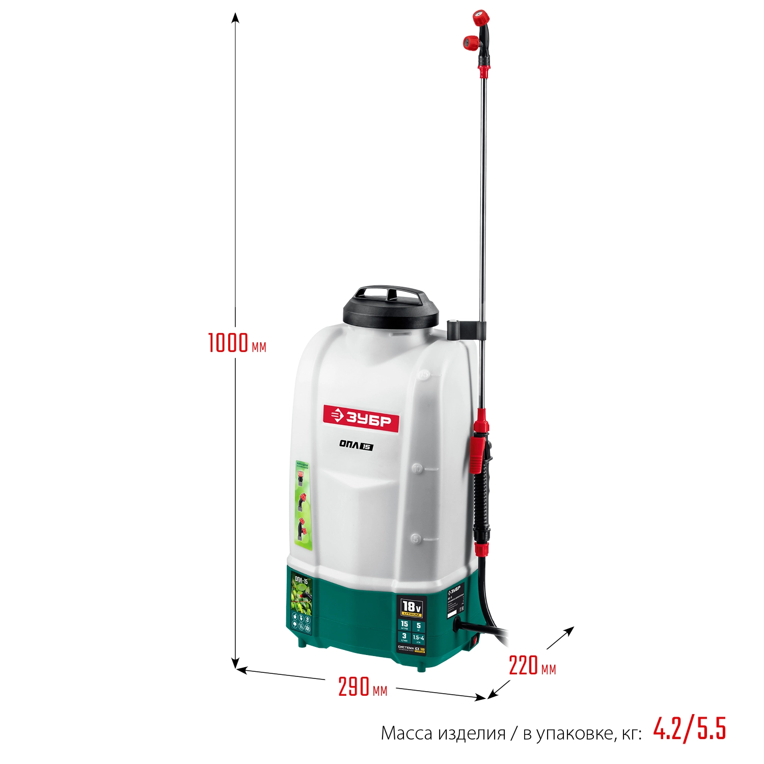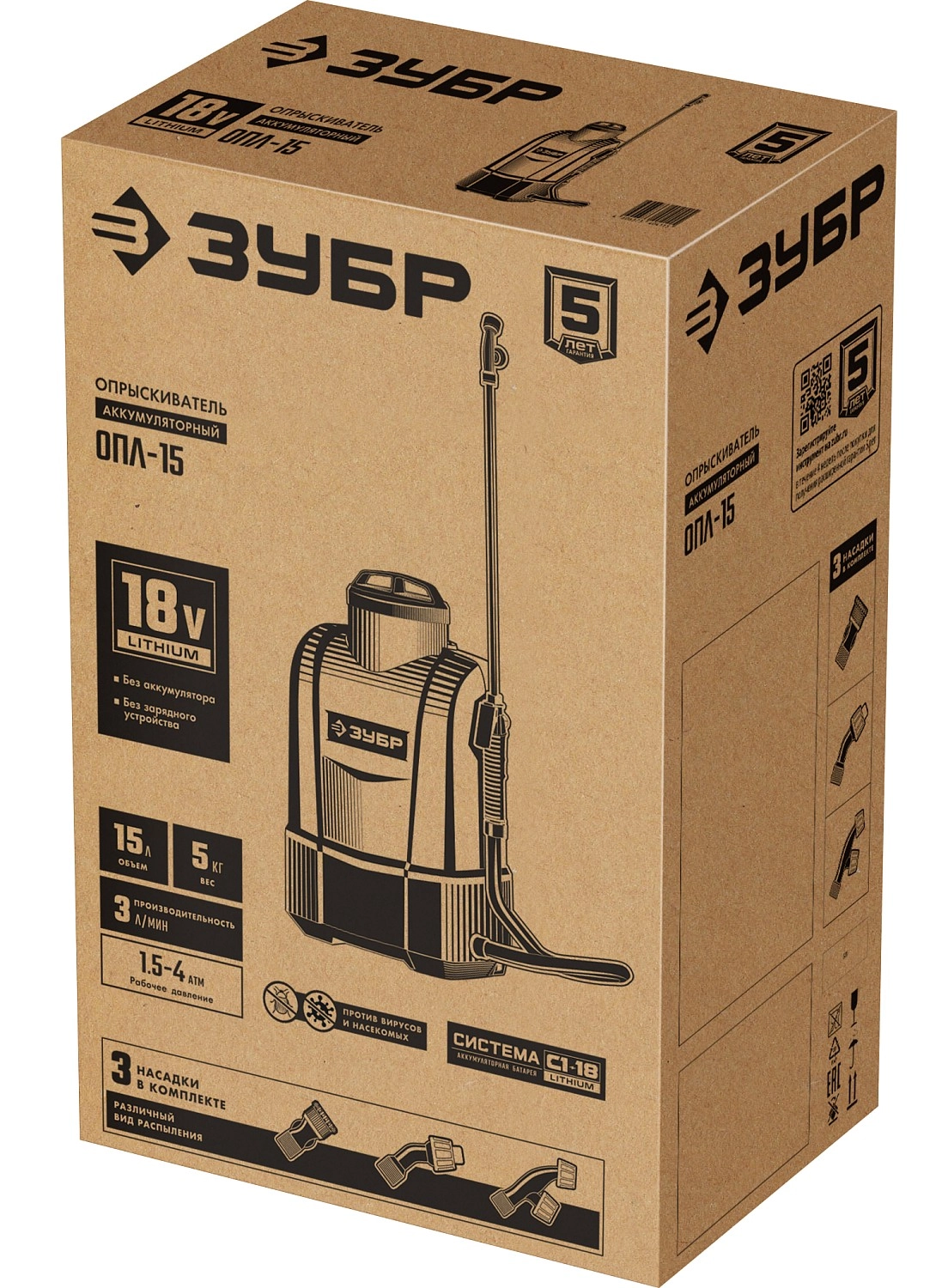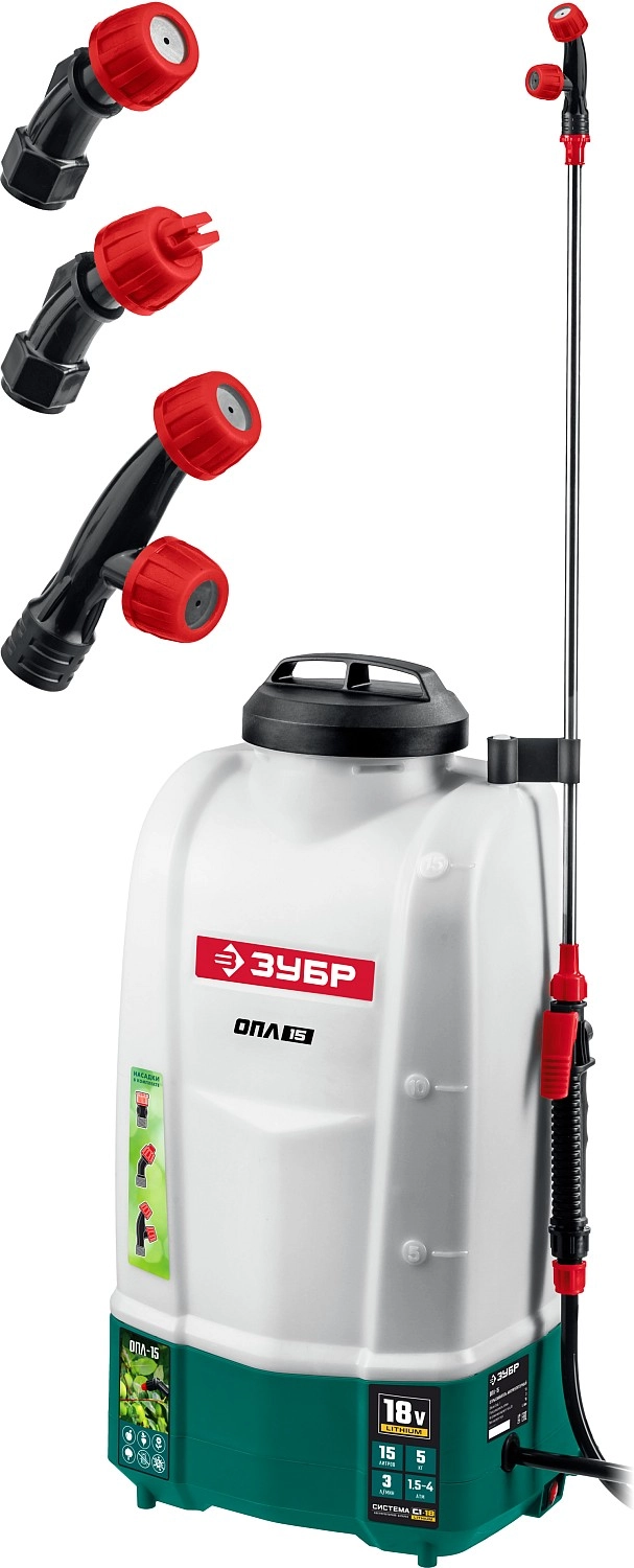 ПроизводителиОпрыскиватель ранцевый аккум. ОПЛ-15 (18.0 В, без АКБ и ЗУ, бак 15 литров, расход 5 л/мин) ЗУБР