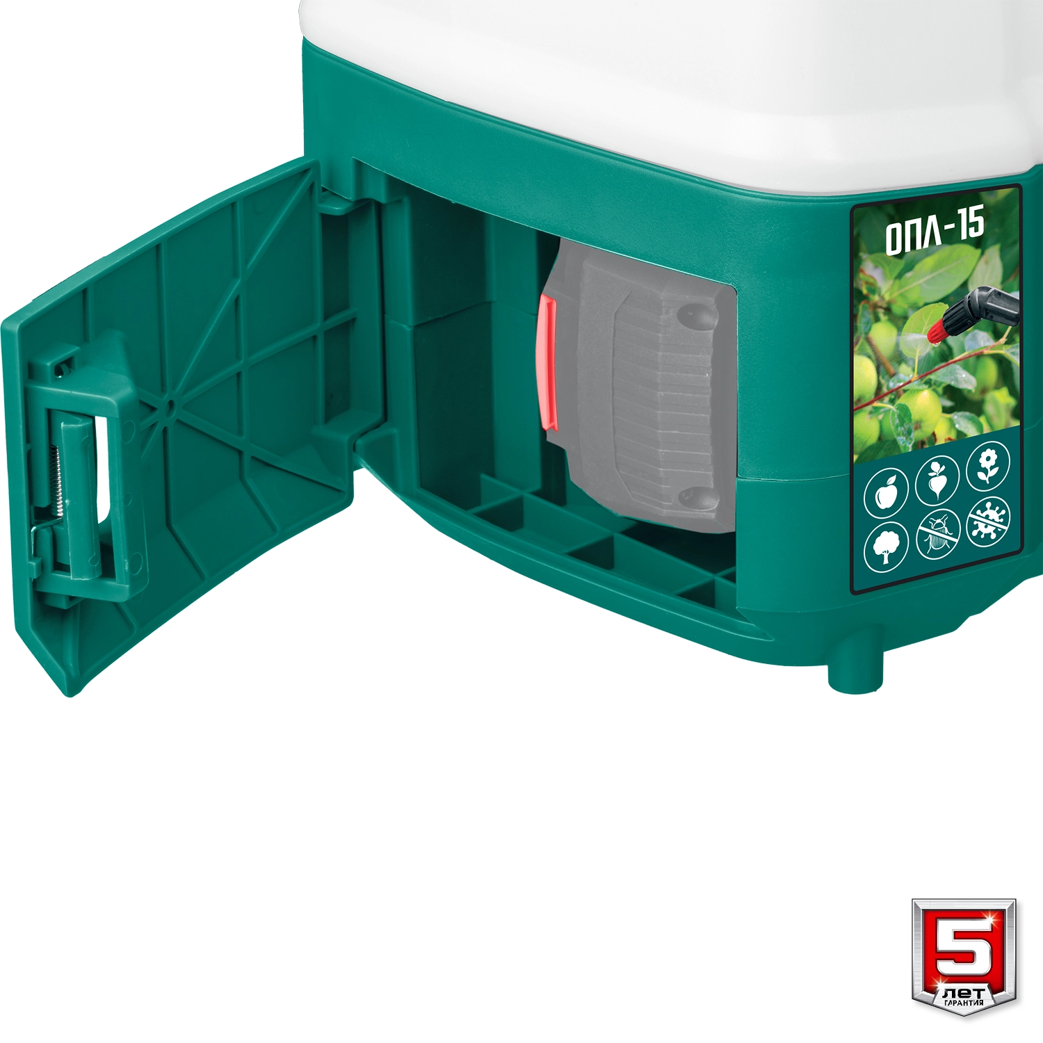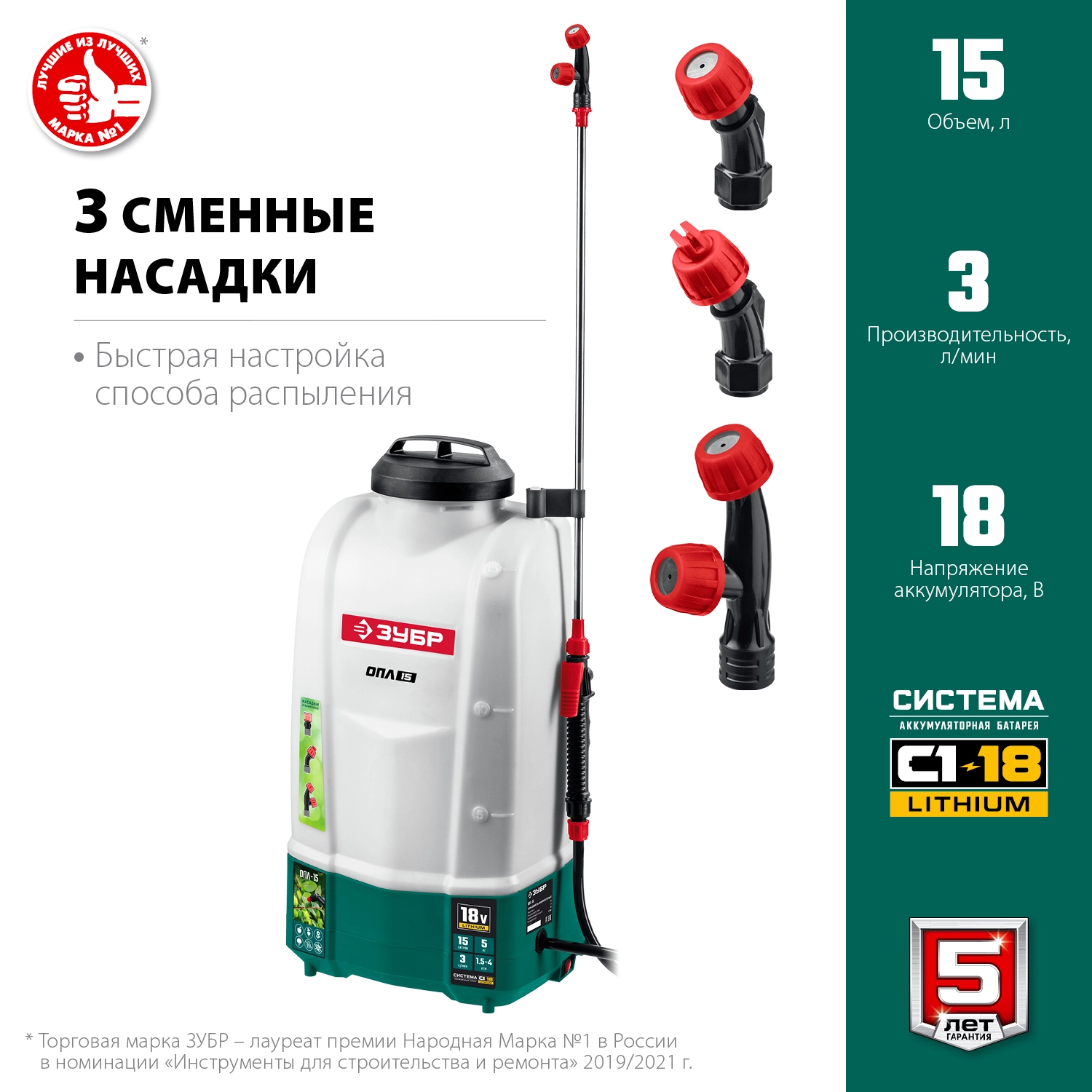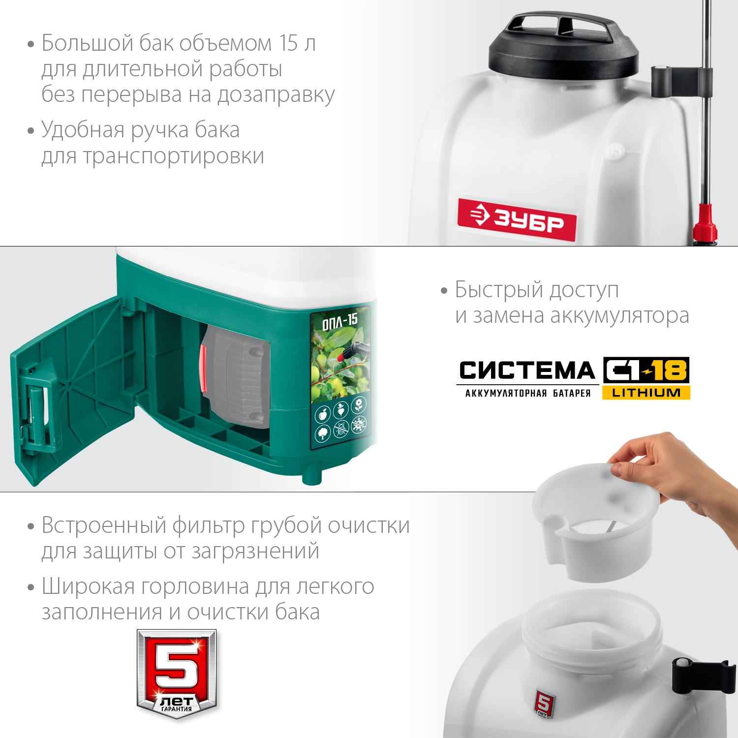 ПроизводителиОпрыскиватель ранцевый аккум. ОПЛ-15 (18.0 В, без АКБ и ЗУ, бак 15 литров, расход 5 л/мин) ЗУБР