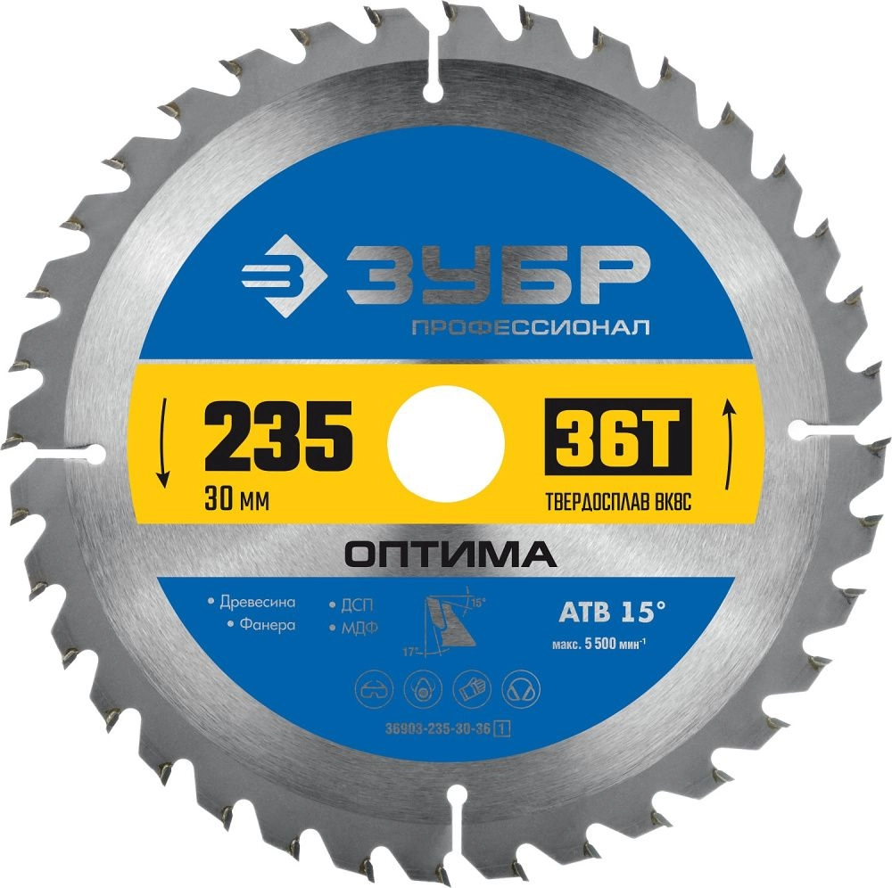 ХарактеристикиАртикул 36903-235-30-36_z01Бренды ЗубрСтрана производства КитайКоличество зубьев 36Диаметр, мм 235Посадочный диаметр 30Толщина, мм 2Толщина круга 1.8Тип геометрии зубьев АТВМатериал зубьев твердый сплав ВК 8Ширина реза, мм 2.6Вес 0.76Оптима - универсальный пильный диск, для быстрого распила всех типов древесины. Применяется для распила твердых и мягких пород дерева, клеевых плит, древесно-стружечных плит и МДФ( в том числе облицованных натуральным шпоном, меланиновой пленкой. бумагой. пластиком и др.)фанеры и облицованной фанеры
