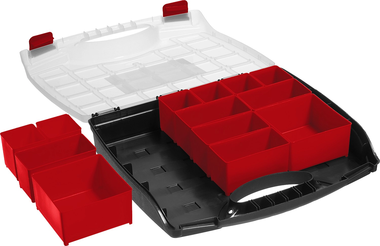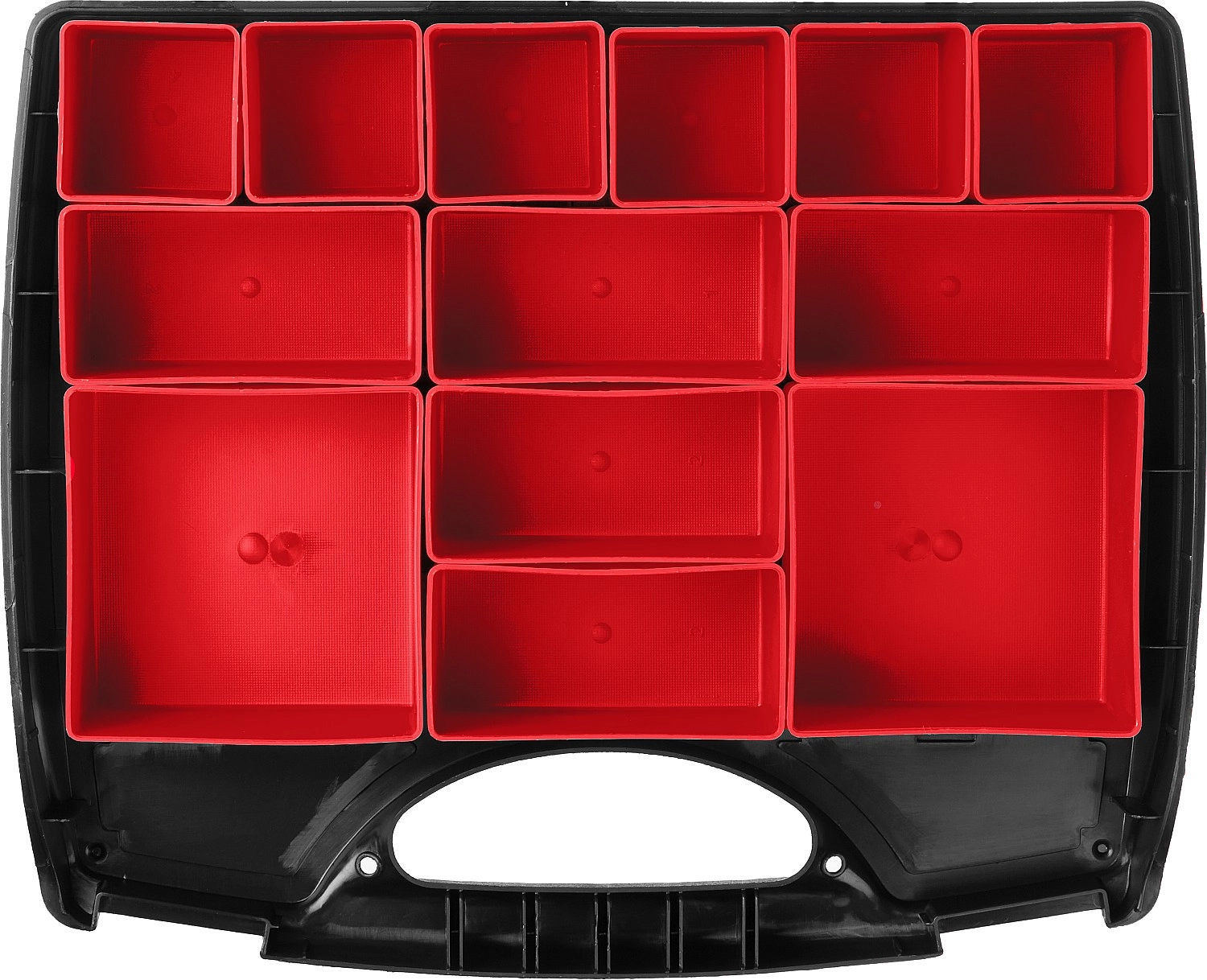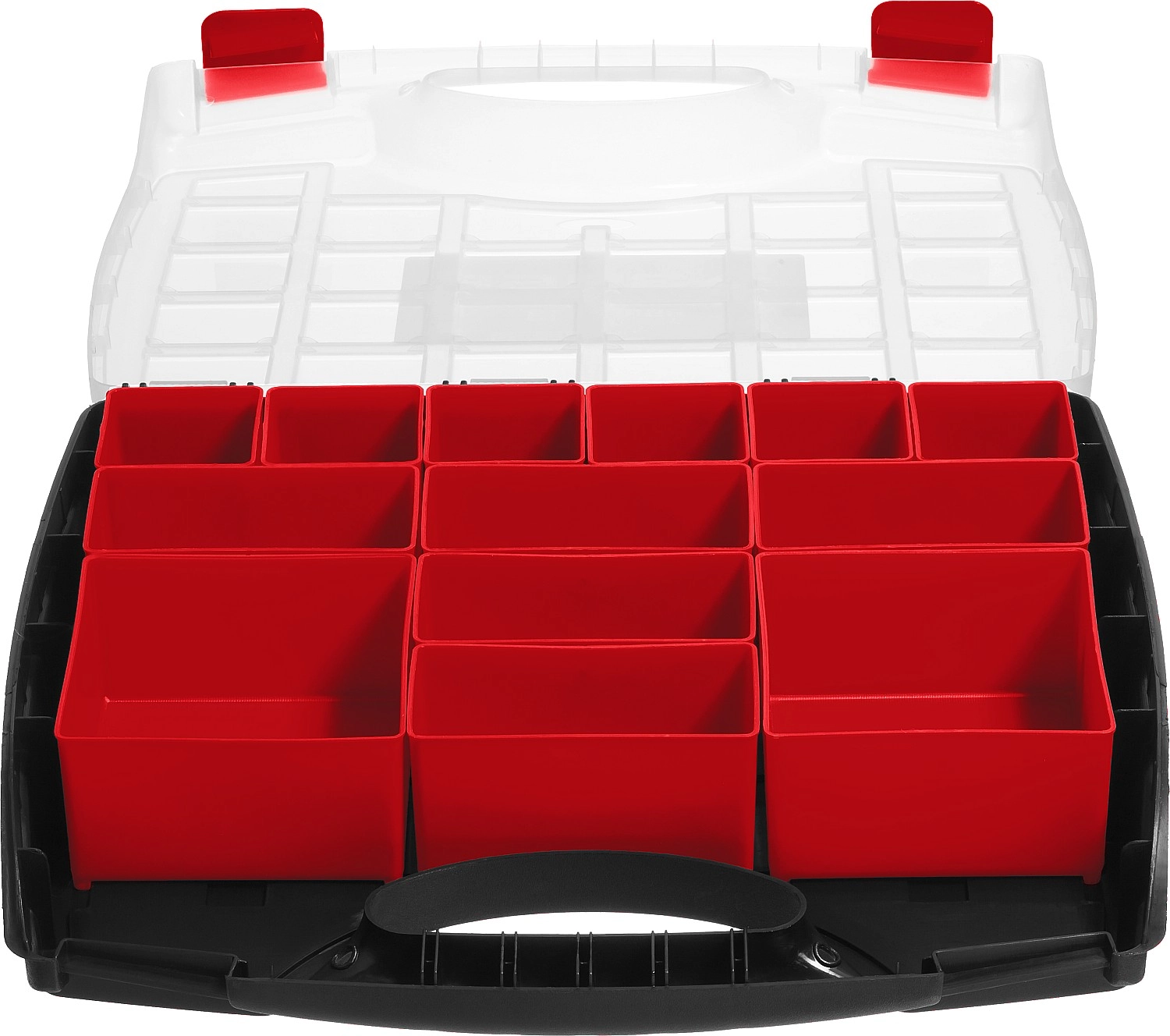Съемные лотки органайзера позволяют организовать удобное хранение и переноску принадлежностей к ниструментам