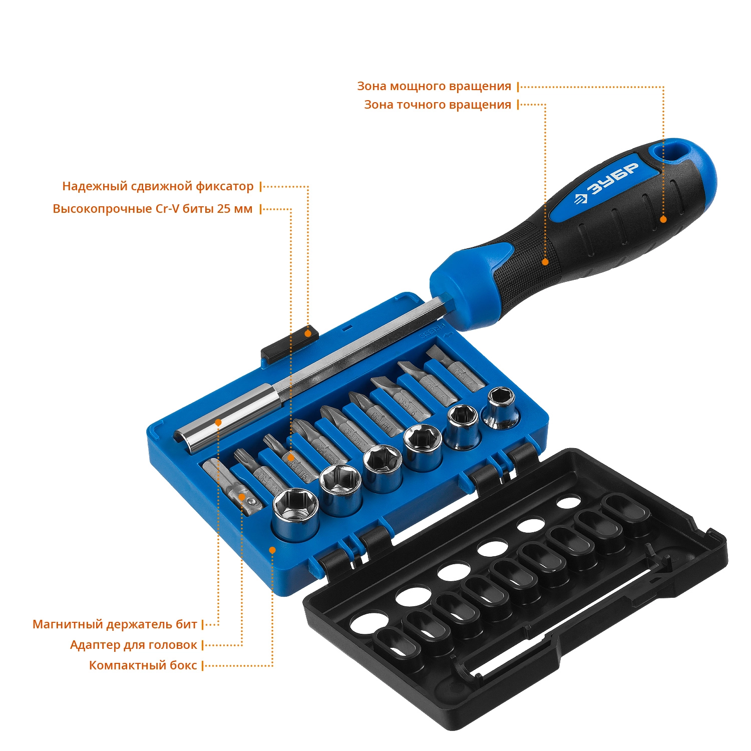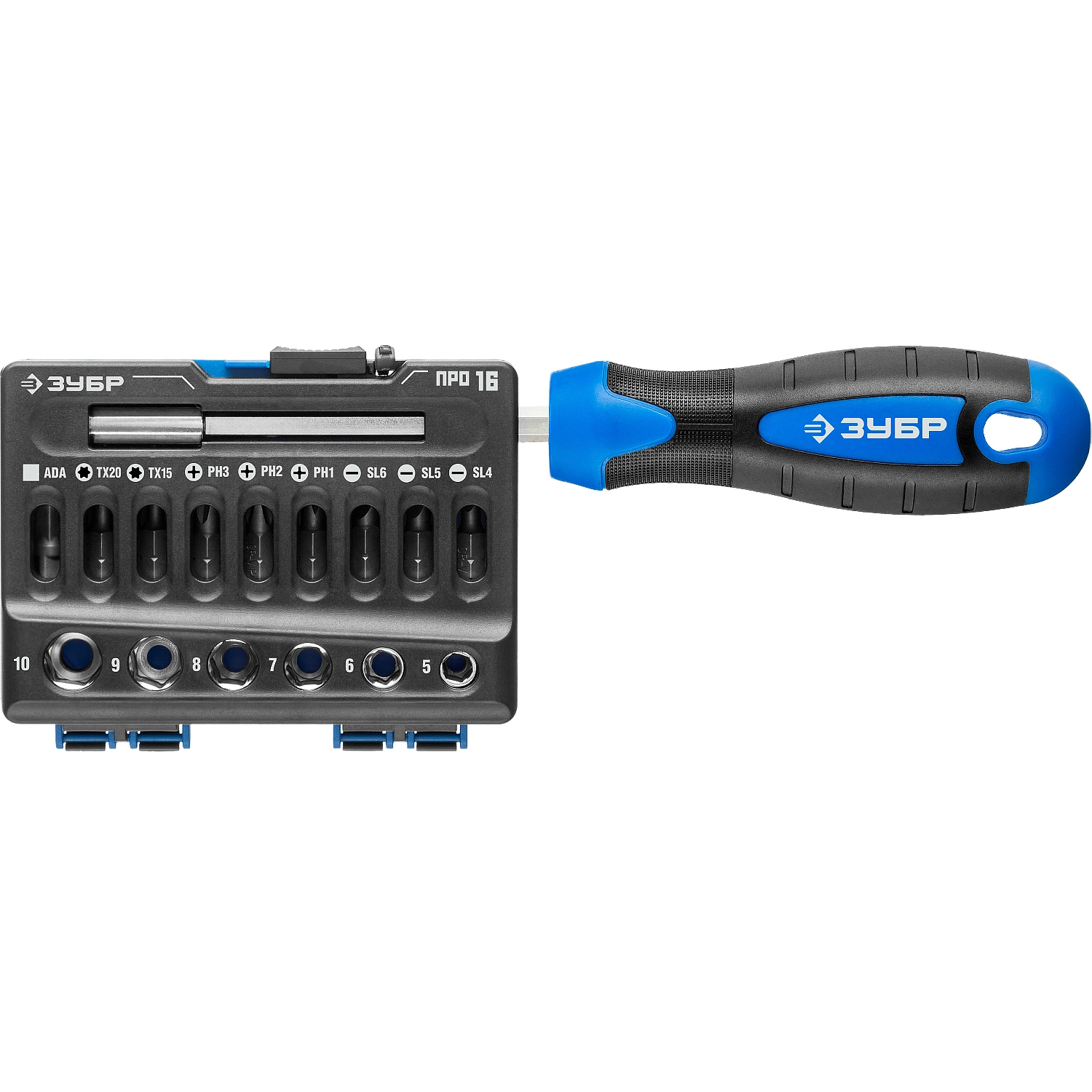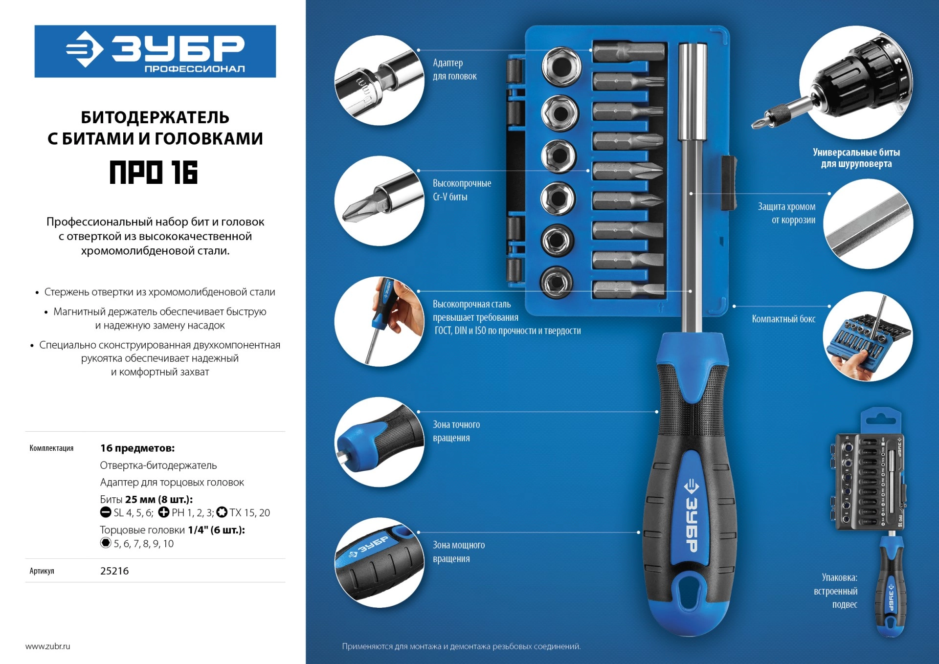 ПроизводителиНабор:отвертка с битами и головками, Cr-V, в блистере "ПРО 16" (25216) ЗУБР