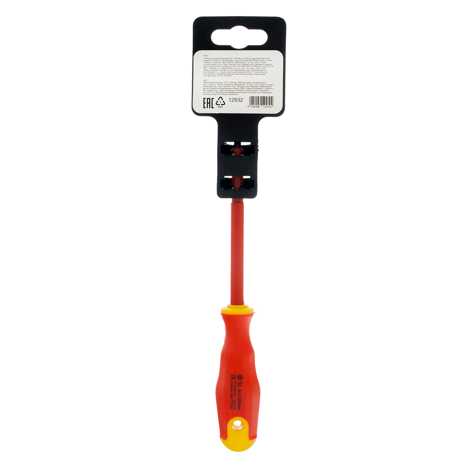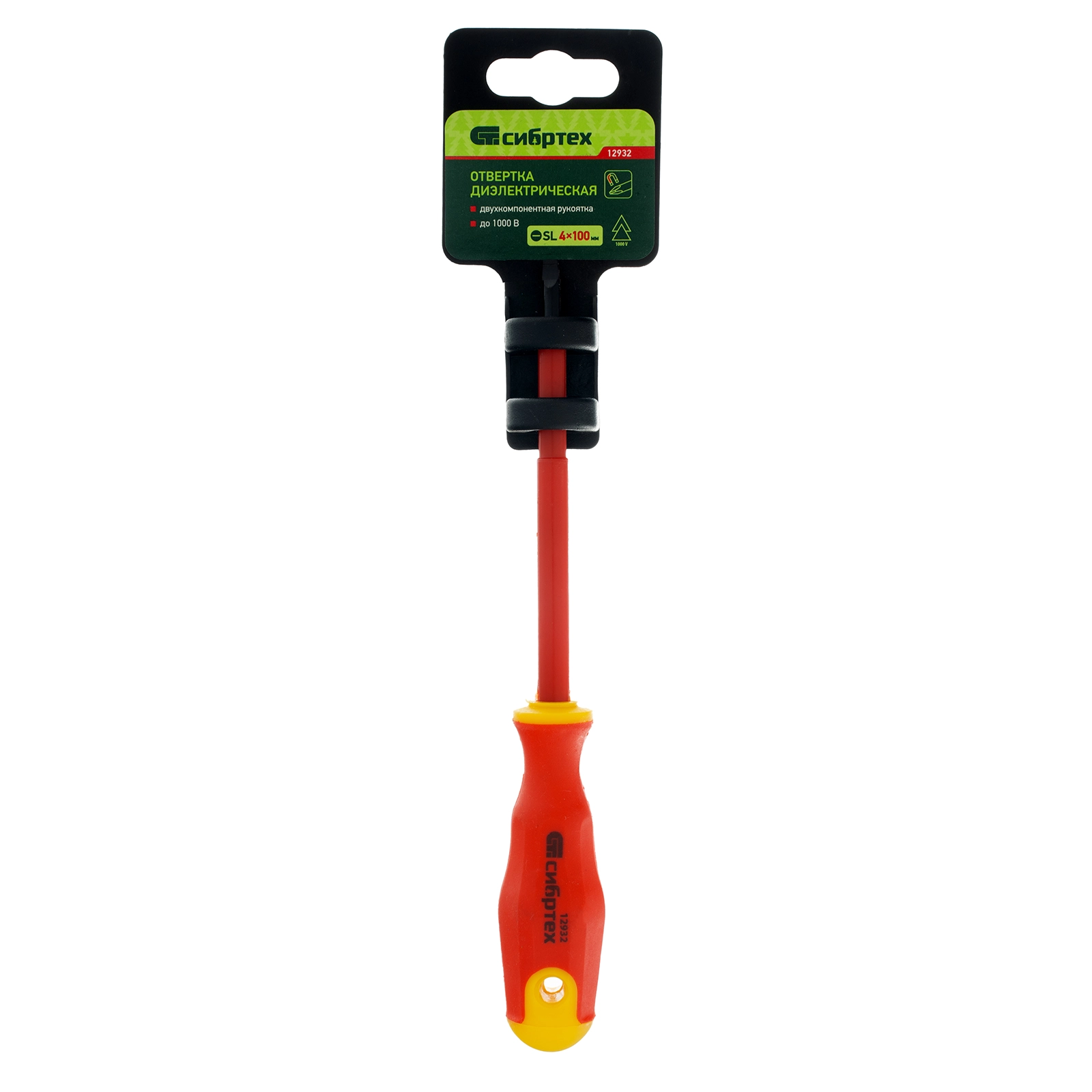 Диэлектрическая отвертка Сибртех 12932, SL4 х 100 мм, из стали CrV, с двухкомпонентной рукояткой, используется для монтажа/демонтажа крепежных элементов типа Slotted «минус». Отвертка рассчитана на полупрофессиональное применение: замену розеток, подключение электросчетчиков и т.д. Длина стержня 100 мм удобна для работы с крепежом на поверхности и в углублениях. Внимание — техника безопасности запрещает выполнять работы под напряжением!Производитель: ООО "Мир инструмента", Россия