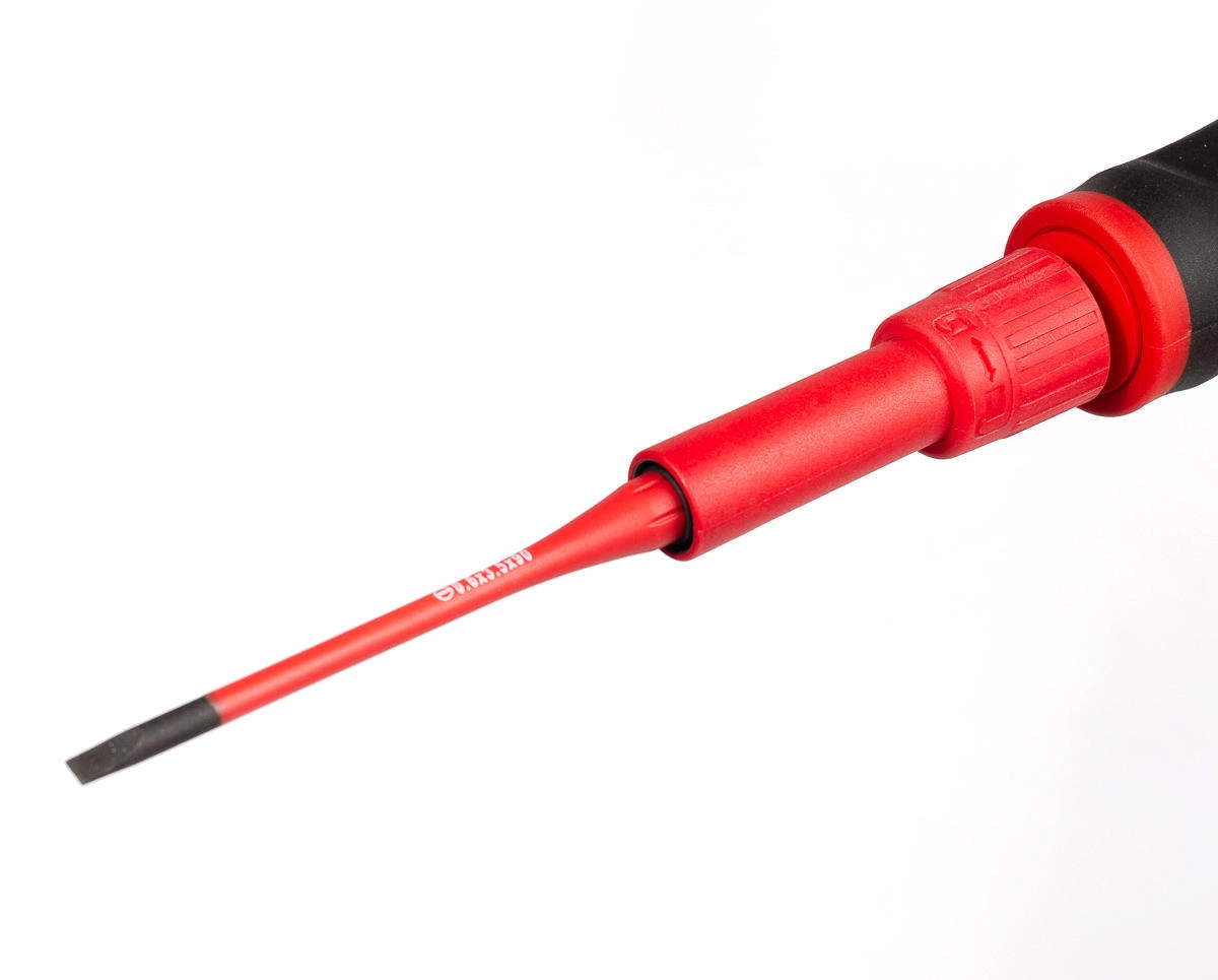 Диэлектрическая динамометрическая отвертка со сменными битами НИО-3309, 9 шт., серия «Слим», КВТ 78279 — предназначена для работы под напряжением до 1000 В. В наборе 9 бит, рукоятка и ключ для настройки усилия