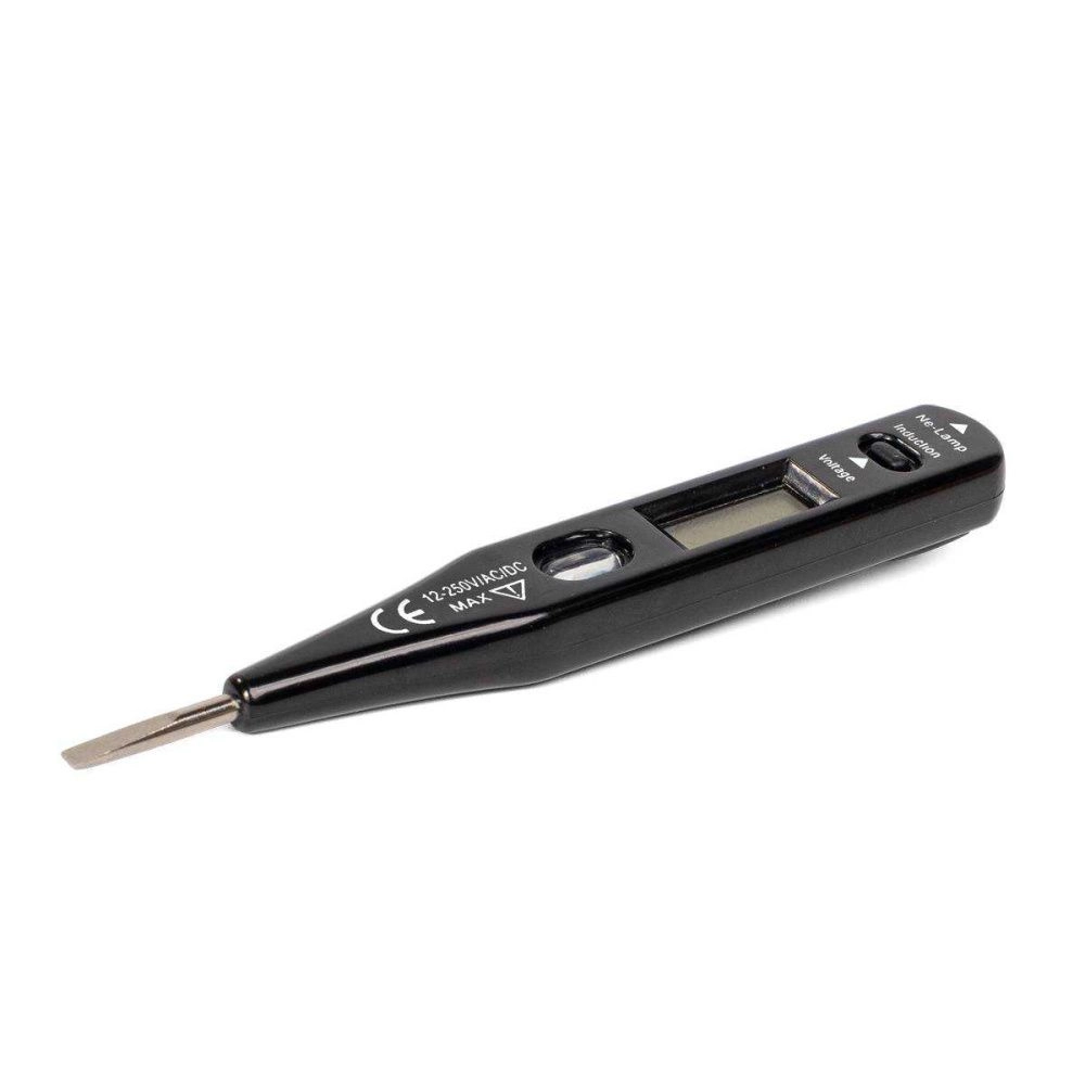 Серия Профи Тестер для контактного или бесконтактного определения наличия переменного напряжения в диапазоне от 12 до 220 В с ЖК-дисплеем Контактное определение напряжения: удерживая кнопку «VOLTAGE», прикоснуться контактным электродом к проводнику. При наличии напряжения, его значение отобразится на дисплее удерживая сенсор «INDUCTION», прикоснуться контактным электродом к проводнику. При наличии напряжения, загорится индикаторная лампочка