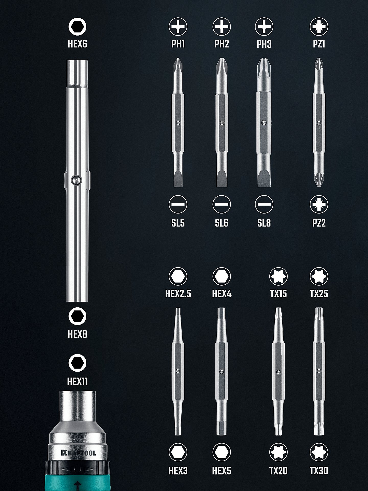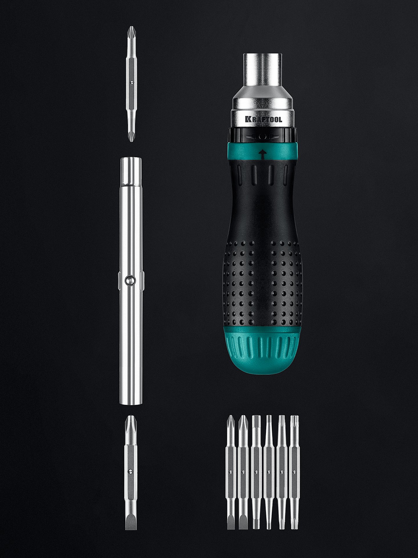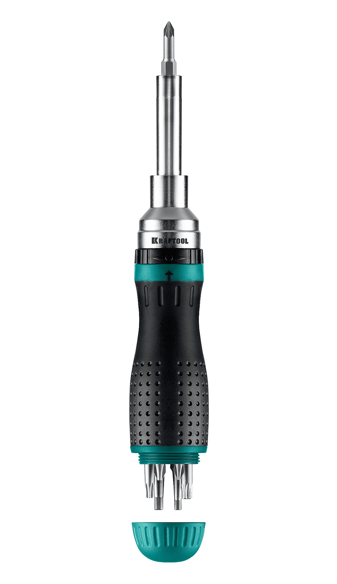 Бренд: KRAFTOOLПрофессиональная мощная реверсивная отвертка с максимальной комплектацией в одном корпусе