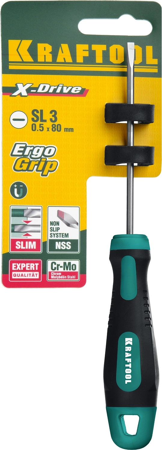ПроизводителиОтвертка KRAFTOOL, Cr-Mo-V сталь, двухкомпонентная противоскользящая рукоятка, SL, 3,0x80мм