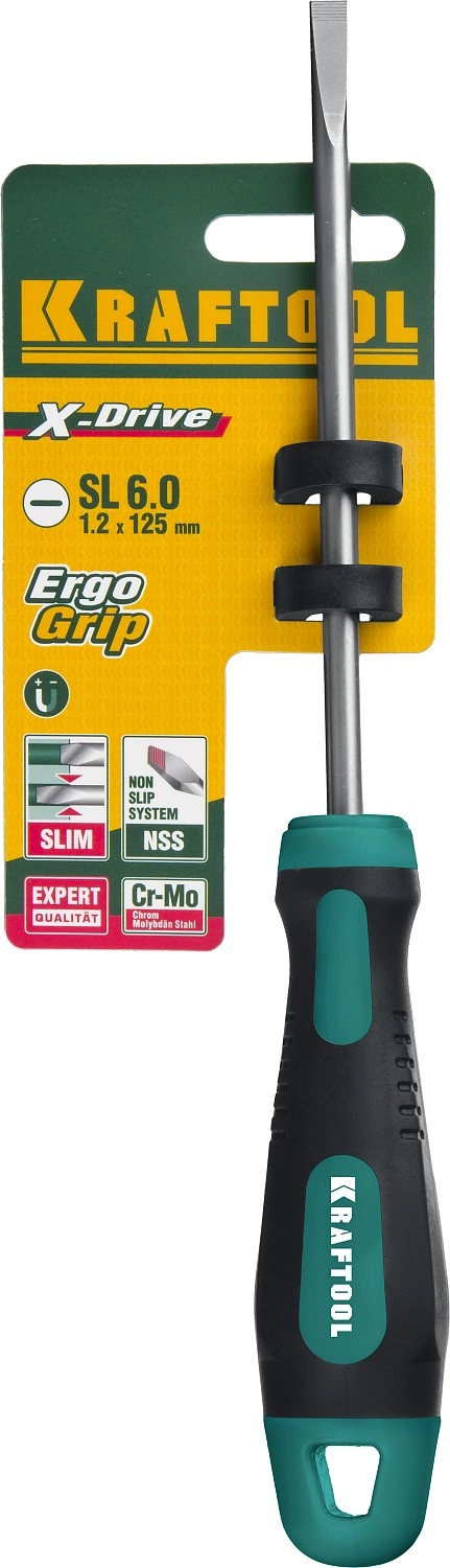 ПроизводителиОтвертка KRAFTOOL, Cr-Mo-V сталь, двухкомпонентная противоскользящая рукоятка, SL, 6,0x125мм