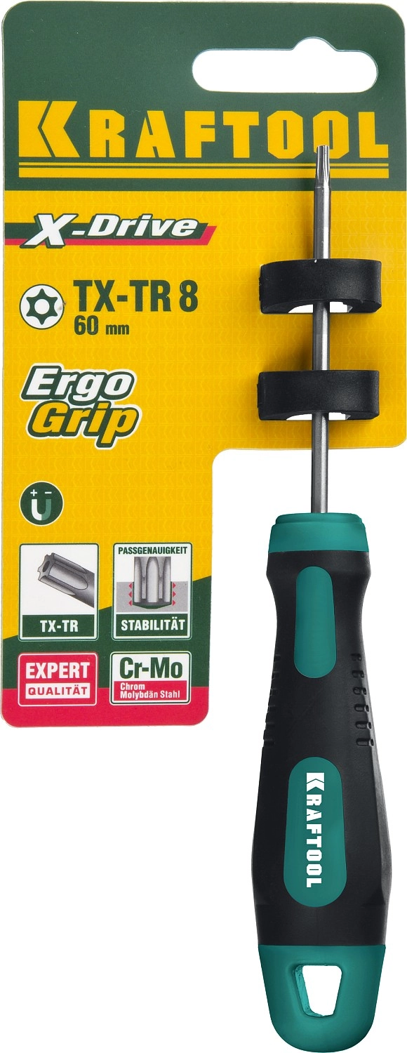 ПроизводителиОтвертка TORX TX 8x60мм, с отв., двухкомп. противоскол. рукоятка, Cr-Mo-V (250077-8-060) KRAFTOOL