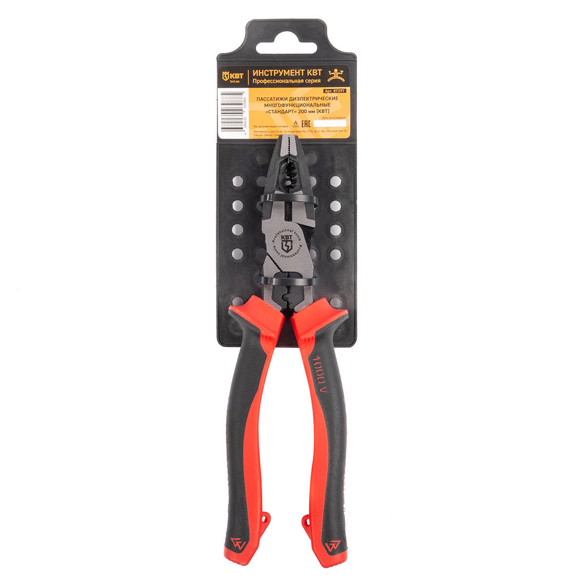 Пассатижи многофункциональные диэлектрические, 200 мм, серия «Стандарт», КВТ 87297 — предназначены для захвата и удержания плоских и круглых деталей, резки проводов, снятия изоляции с проводов, опрессовки наконечников на провод