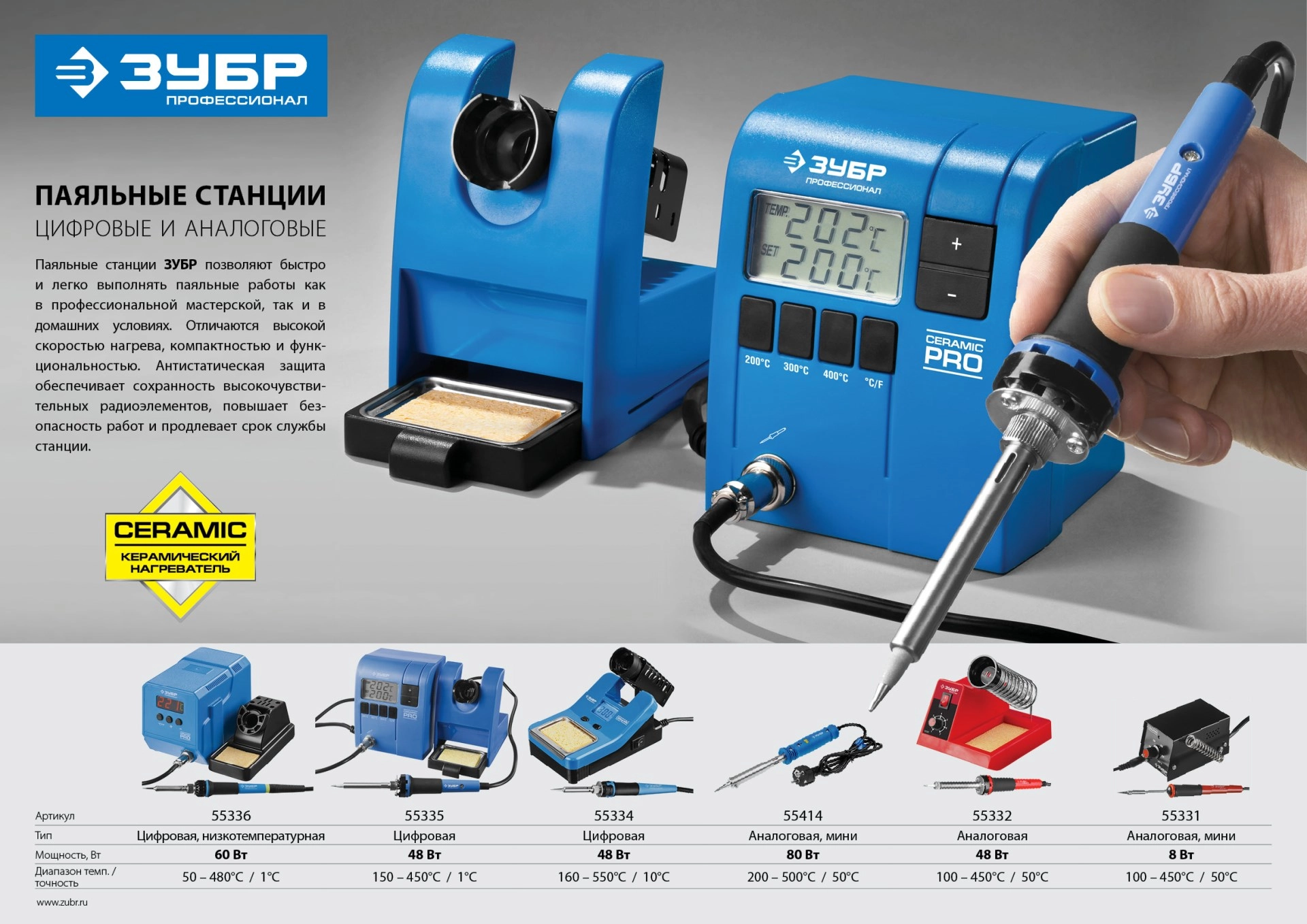 ПроизводителиПаяльная станция аналоговая, диапазон 100-450°C, с подставкой "МАСТЕР" (55332) ЗУБР