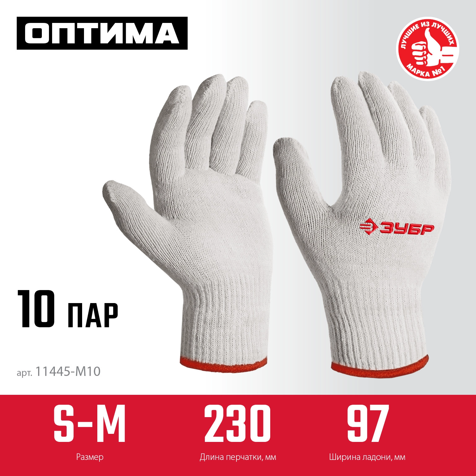 ПроизводителиПерчатки ОПТИМА, S-M, х/б перчатки без покрытия, 10 класс, 10 пар (11445-M10) ЗУБР