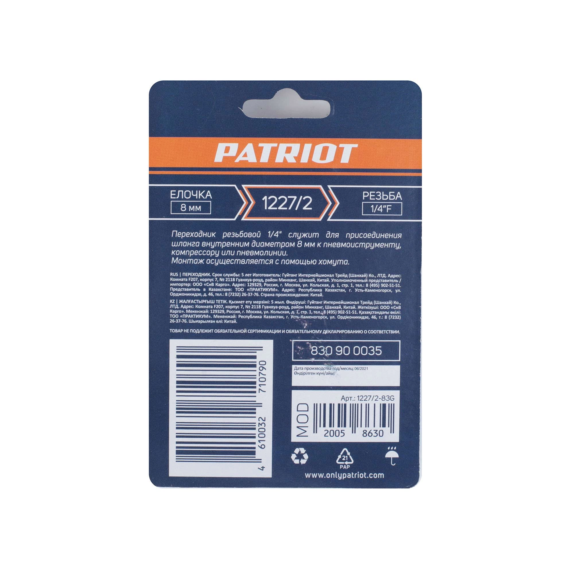 ПРОФИУровень качества. При классификации продуктов, имеющих схожее наименование, но обладающие различными потребительскими свойствами мы приняли следующий Вес факторов: 80% - подтвержденный ресурс, 15% - заявленная производительность/скорость, 5% - субъективные ощущения потребителя. ПодробнееКод товара: 0062607(0)Переходник PATRIOT 1227/2 для присоединения шланга к пневмоинструменту, компрессору или пневмолинии. Переход с «елочки» 8 мм на внутреннюю резьбу 1/4 дюйма (6,35 мм). Монтаж осуществляется с помощью хомутаПроизводитель: 11th Flooor,LiYuanShangdu Building A2,201# LanTian Road,NingBo China