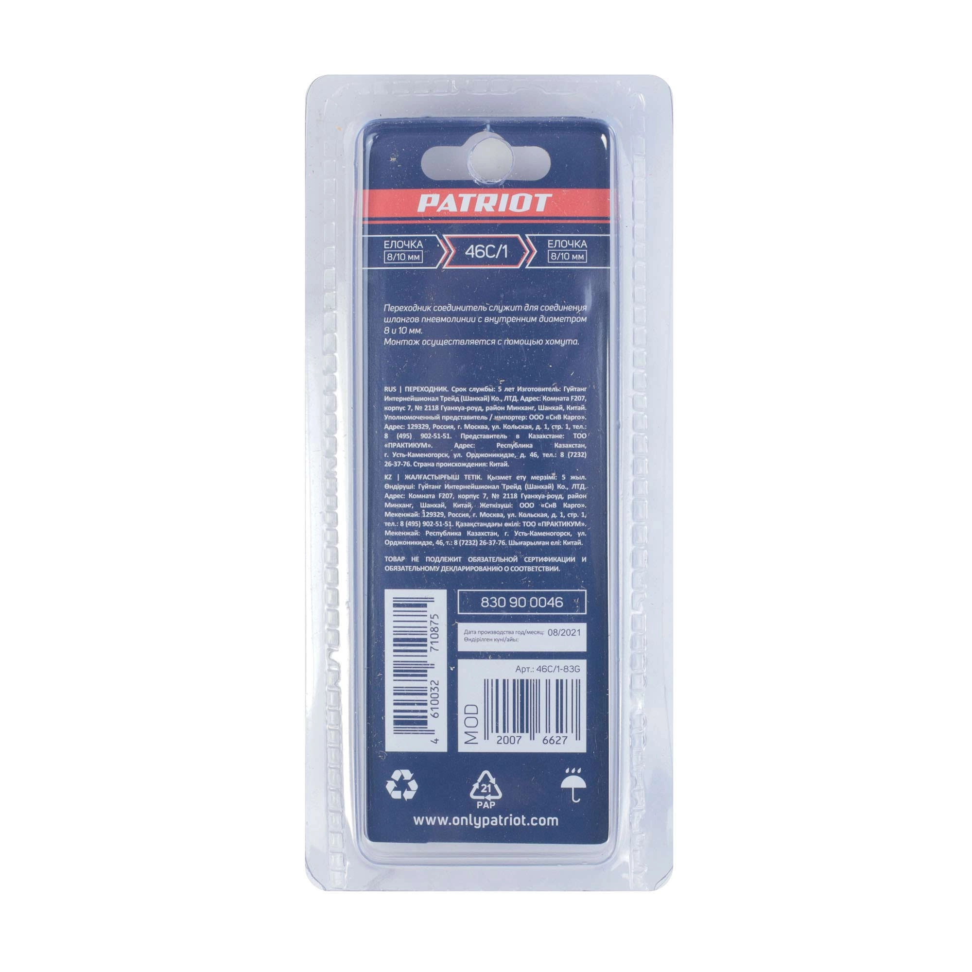 ПРОФИУровень качества. При классификации продуктов, имеющих схожее наименование, но обладающие различными потребительскими свойствами мы приняли следующий Вес факторов: 80% - подтвержденный ресурс, 15% - заявленная производительность/скорость, 5% - субъективные ощущения потребителя. ПодробнееКод товара: 0062590(0)Переходник PATRIOT 46C/1 для соединения пневмолинии с внутренними шлангами. Переход с «елочки» 8 мм. на 1/4 дюйма (6,35 мм). Монтаж осуществляется с помощью хомутаПроизводитель: 11th Flooor,LiYuanShangdu Building A2,201# LanTian Road,NingBo China