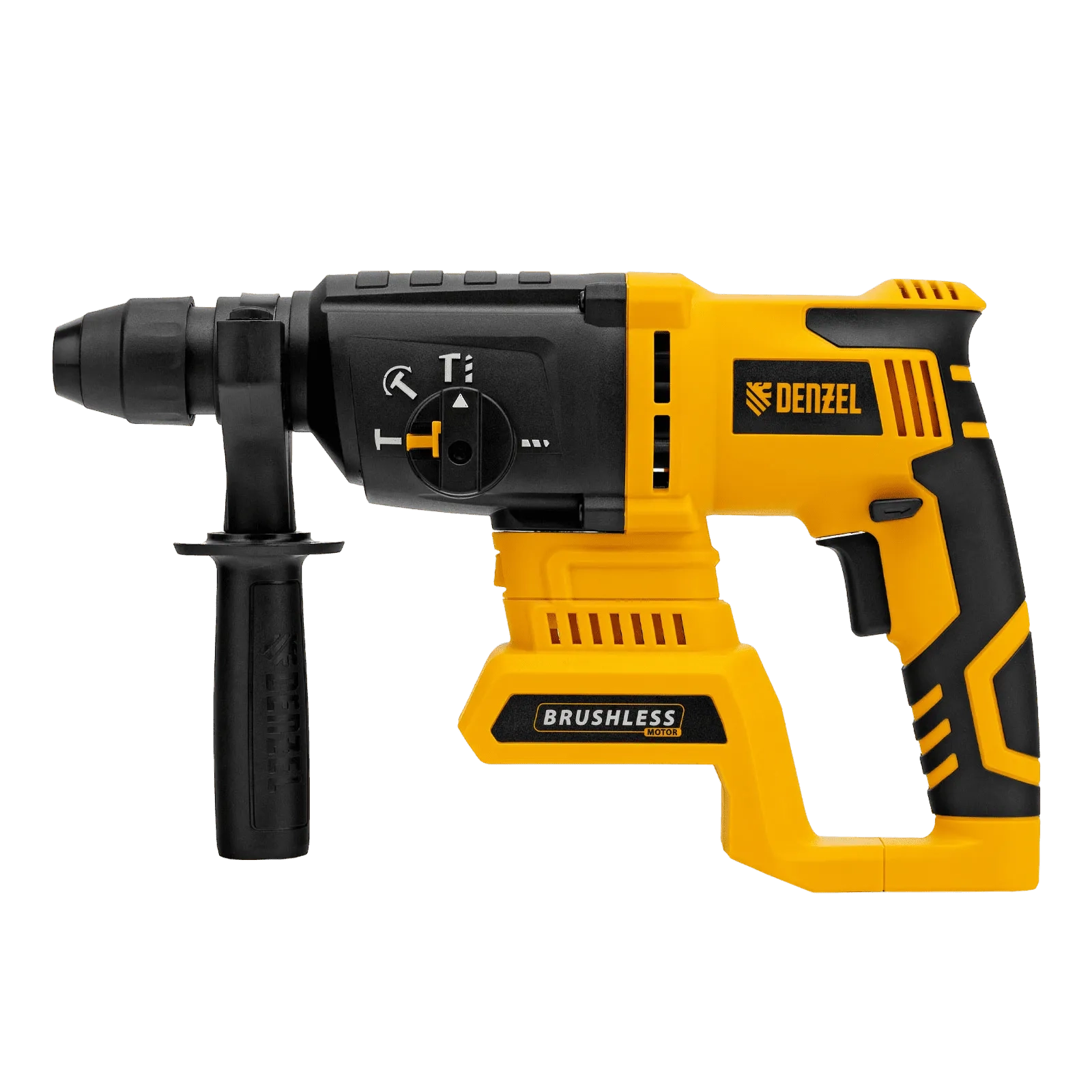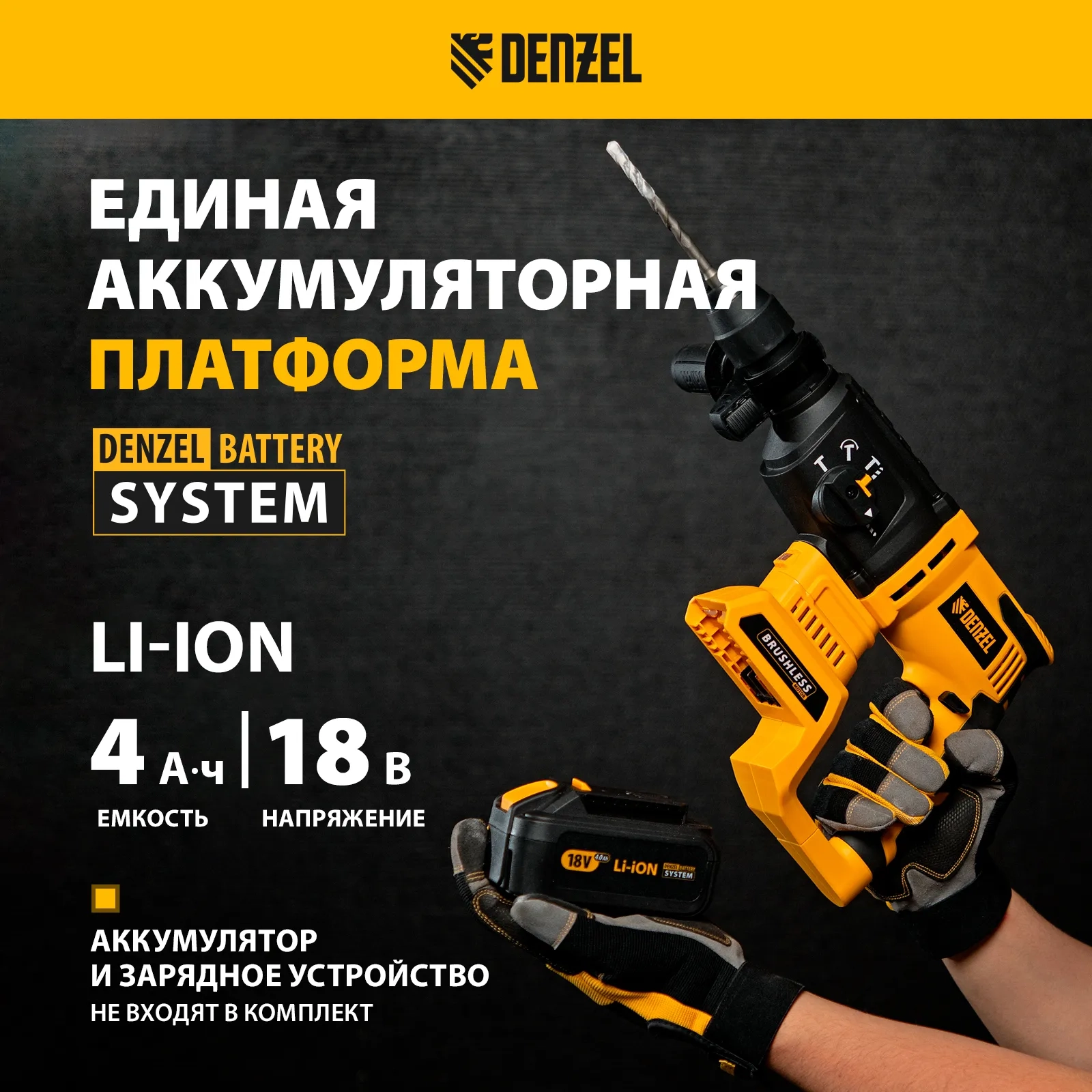 - Универсальность — к перфоратору подходит любой Li-Ion аккумулятор единой платформы Denzel Battery System 18V.