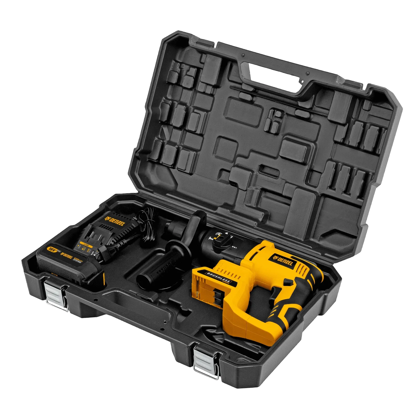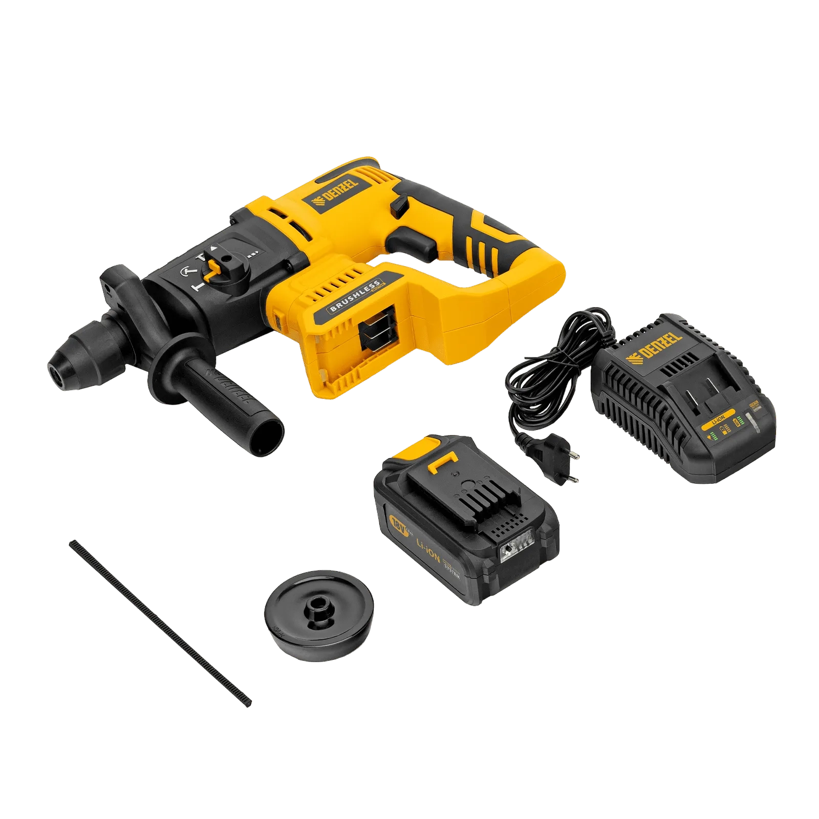 Аккумуляторный перфоратор Denzel BLRH-IB-26 26701 с аккумулятором Li-Ion емкостью 4 Ач и напряжением 18 В предназначен для сверления отверстий в различных материалах, а также для штробления стен, разрушения кирпичной кладки. Поддерживает несколько режимов работы: сверление, бурение, долбление + регулировка положения долота (опция Vario Lock). Максимальный диаметр отверстий в древесине составляет 40 мм, металле — 13 мм, бетоне — 26 мм. Инструмент совершает до 4800 ударов в минуту, развивая энергию до 3 Дж, чем обусловлена его высокая производительность и эффективная работа с твердыми материалами. Перфоратор пригодится для проведения строительных и ремонтных работ.