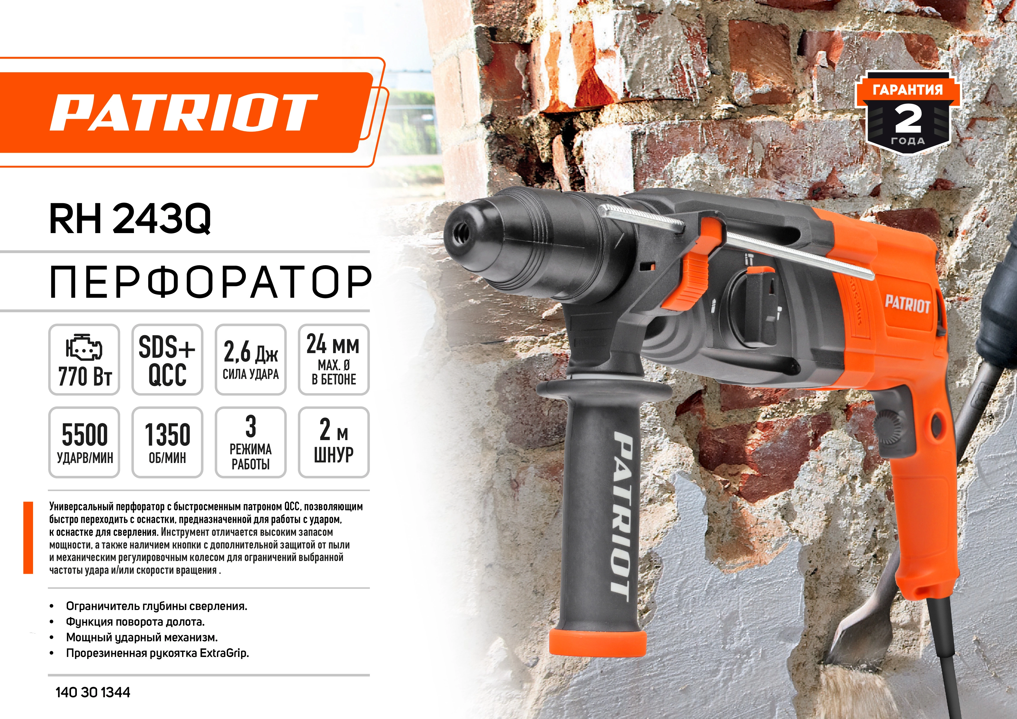 ПРОФИУровень качества. При классификации продуктов, имеющих схожее наименование, но обладающие различными потребительскими свойствами мы приняли следующий Вес факторов: 80% - подтвержденный ресурс, 15% - заявленная производительность/скорость, 5% - субъективные ощущения потребителя. ПодробнееКод товара: 0074568ХарактеристикиАртикул 140301344Бренды PATRIOTСтрана производства КитайГарантия 12 месяцевГабариты (ШхВхГ),мм 270х420х110Тип патрона SDS-plusПотребляемая мощность 770Энергия единичного удара 2.6Число оборотов холостого хода 1350Макс. диаметр сверления, дерево 30Макс. диаметр сверления, металл 13Макс. диаметр сверления, бетон 26Число ударов 5500Рукоятка прорезиненная + доп. рукояткаРеверс ДаДвигатель/Тактность щеточныйДлина сетевого шнура 2.1Регулировка скорости естьКейс в комплекте естьМакс. диаметр сверления (полой коронкой) 68Блокировка кнопки включения естьБыстросменный патрон естьИндикатор износа угольных щеток нетМеталлический корпус редуктора естьОграничитель глубины сверления ДаПредохранительная муфта ДаВес 5.3Питание сетьМакс. число оборотов холостого хода 1350Макс. количество ударов в минуту 5500Макс. энергия удара 2.6Макс. диаметр сверления (дерево) 13Макс. диаметр сверления (металл) 24Макс. диаметр сверления (бетон) 30Режим работы - сверление ДаРежим работы - долбление ДаОписание набора Перфоратор - Патрон QCC (быстрозажимной) - Дополнительная рукоятка - Ограничитель глубины сверления - Пластиковый кейс - Инструкция по эксплуатацииДополнительная рукоятка ДаПылесборник НетРежимы работы - сверление с ударом ДаШтатив НетОписание товара обновлено 28.01.2026 16:51:17• Усиленная защита от пыли – бронирование обмоток ротора термостойкой арамидной нитью.