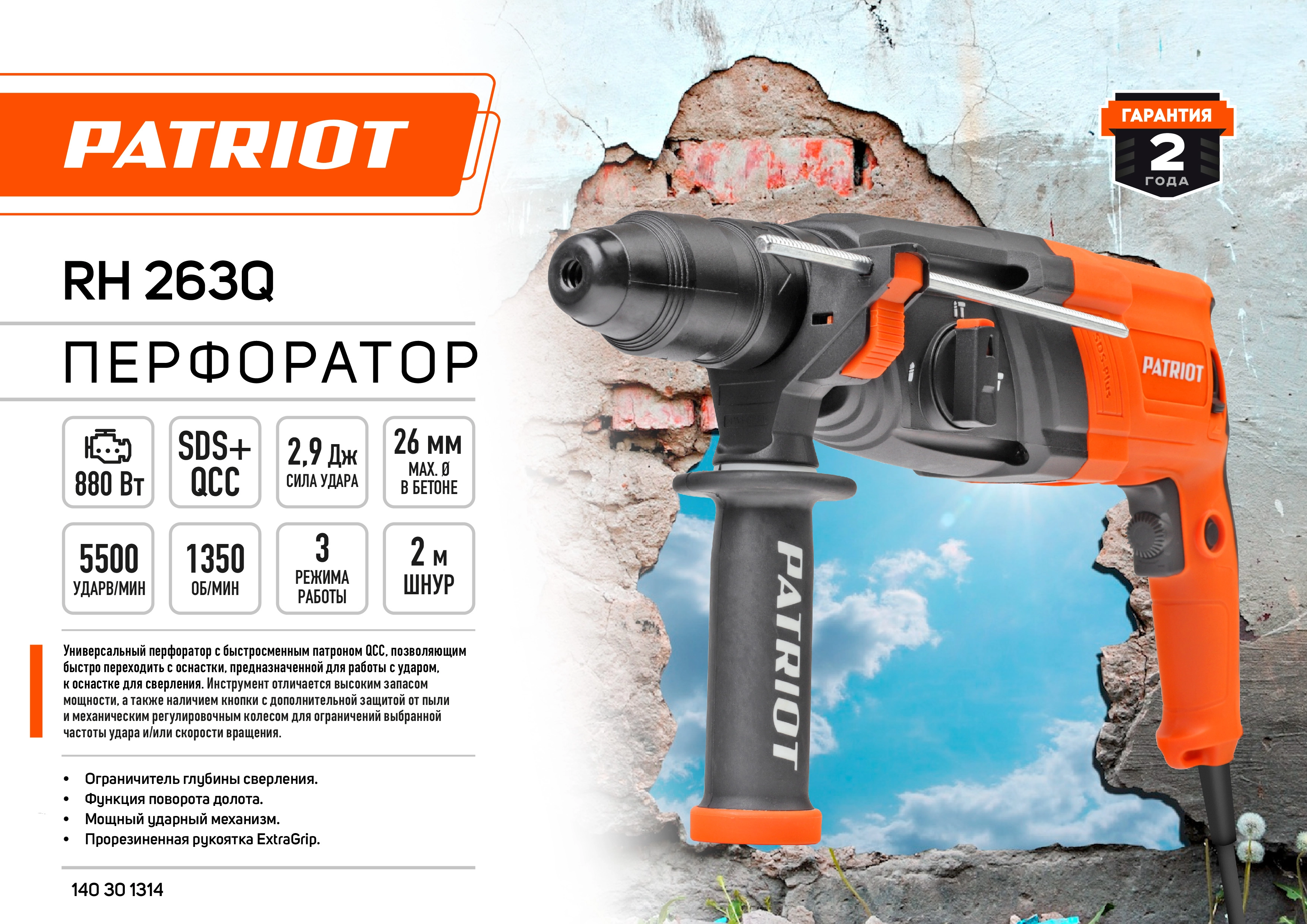 ПРОФИУровень качества. При классификации продуктов, имеющих схожее наименование, но обладающие различными потребительскими свойствами мы приняли следующий Вес факторов: 80% - подтвержденный ресурс, 15% - заявленная производительность/скорость, 5% - субъективные ощущения потребителя. ПодробнееКод товара: 0074570(0)ХарактеристикиАртикул 140301314Бренды PATRIOTСтрана производства КитайГарантия 12 месяцевГабариты (ШхВхГ),мм 270х420х130Тип патрона SDS-plusПотребляемая мощность 880Энергия единичного удара 2.9Число оборотов холостого хода 1350Макс. диаметр сверления, дерево 30Макс. диаметр сверления, металл 13Макс. диаметр сверления, бетон 26Число ударов 5300Рукоятка прорезиненная + доп. рукояткаРеверс ДаДвигатель/Тактность щеточныйДлина сетевого шнура 2.1Регулировка скорости естьКейс в комплекте естьМакс. диаметр сверления (полой коронкой) 68Блокировка кнопки включения естьБыстросменный патрон естьИндикатор износа угольных щеток нетМеталлический корпус редуктора естьОграничитель глубины сверления ДаПредохранительная муфта ДаВес 5.3Питание сетьМакс. число оборотов холостого хода 1350Макс. количество ударов в минуту 5500Макс. энергия удара 2.9Макс. диаметр сверления (дерево) 30Макс. диаметр сверления (металл) 13Макс. диаметр сверления (бетон) 26Режим работы - сверление ДаРежим работы - долбление ДаОписание набора Перфоратор Дополнительная рукоятка Ограничитель глубины сверления Пластиковый кейс Инструкция по эксплуатацииДополнительная рукоятка ДаПылесборник НетРежимы работы - сверление с ударом ДаОписание товара обновлено 08.12.2025 15:37:071. Высокий запас мощности.