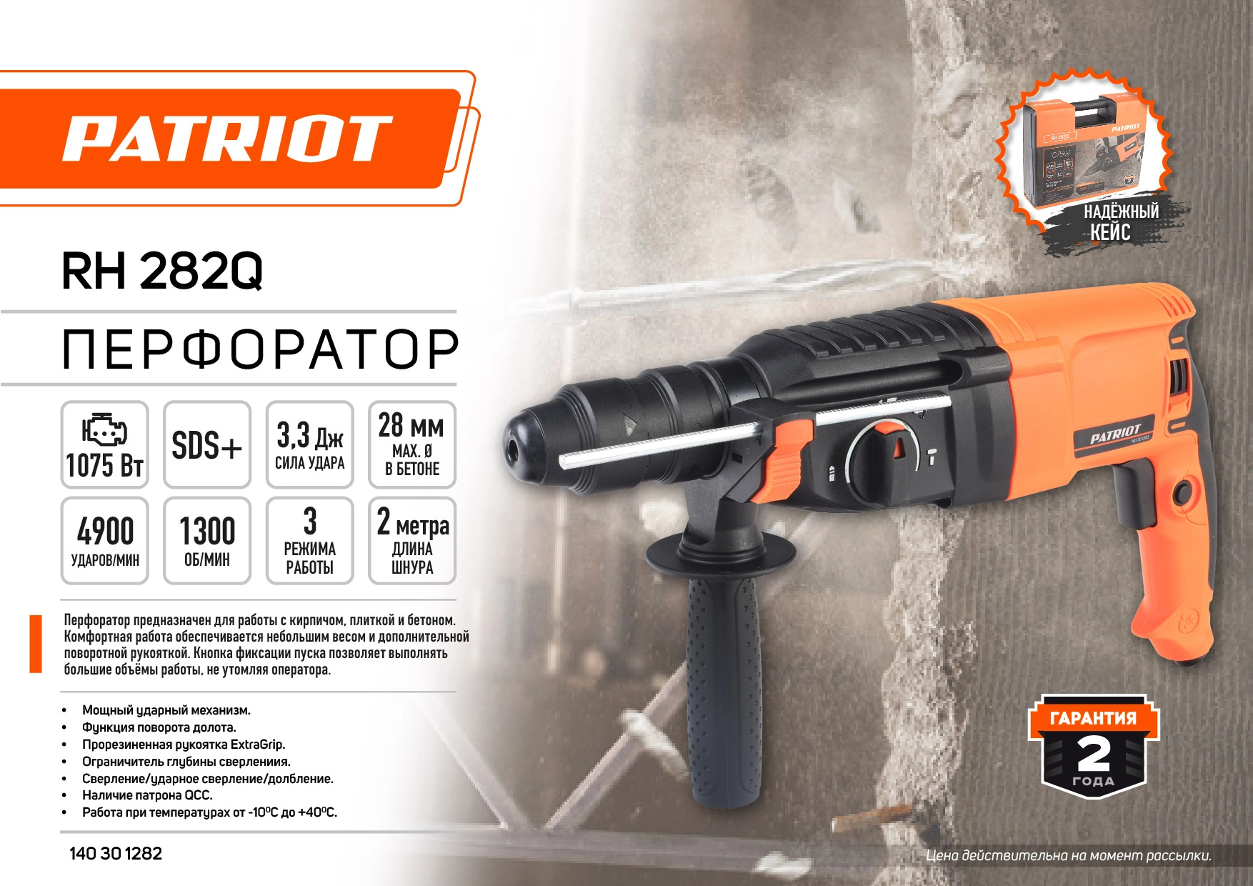 ЭКОНОМУровень качества. При классификации продуктов, имеющих схожее наименование, но обладающие различными потребительскими свойствами мы приняли следующий Вес факторов: 80% - подтвержденный ресурс, 15% - заявленная производительность/скорость, 5% - субъективные ощущения потребителя. ПодробнееКод товара: 0074560ХарактеристикиАртикул 140301283Бренды PATRIOTСтрана производства КитайГарантия 12 месяцевГабариты (ШхВхГ),мм 340х110х420Потребляемая мощность 1075Энергия единичного удара 3.3Число оборотов холостого хода 1300Макс. диаметр сверления, дерево 40Макс. диаметр сверления, металл 13Макс. диаметр сверления, бетон 28Число ударов 4900Рукоятка прорезиненная + доп. рукояткаРеверс естьДвигатель/Тактность щеточныйДлина сетевого шнура 2Регулировка скорости нетКейс в комплекте естьМакс. диаметр сверления (полой коронкой) 68Блокировка кнопки включения естьБыстросменный патрон естьИндикатор износа угольных щеток нетМеталлический корпус редуктора естьОграничитель глубины сверления естьПредохранительная муфта естьВес 4.9RH 282 - перфоратор, предназначенный для работы по бетону, кирпичу, металлу и дереву. Имеет 3 режима работы и функцию реверса. Дополнительная рукоятка и фиксация кнопки включения повышают комфорт при работе с инструментом. Имеет в комплете патрон QCC.