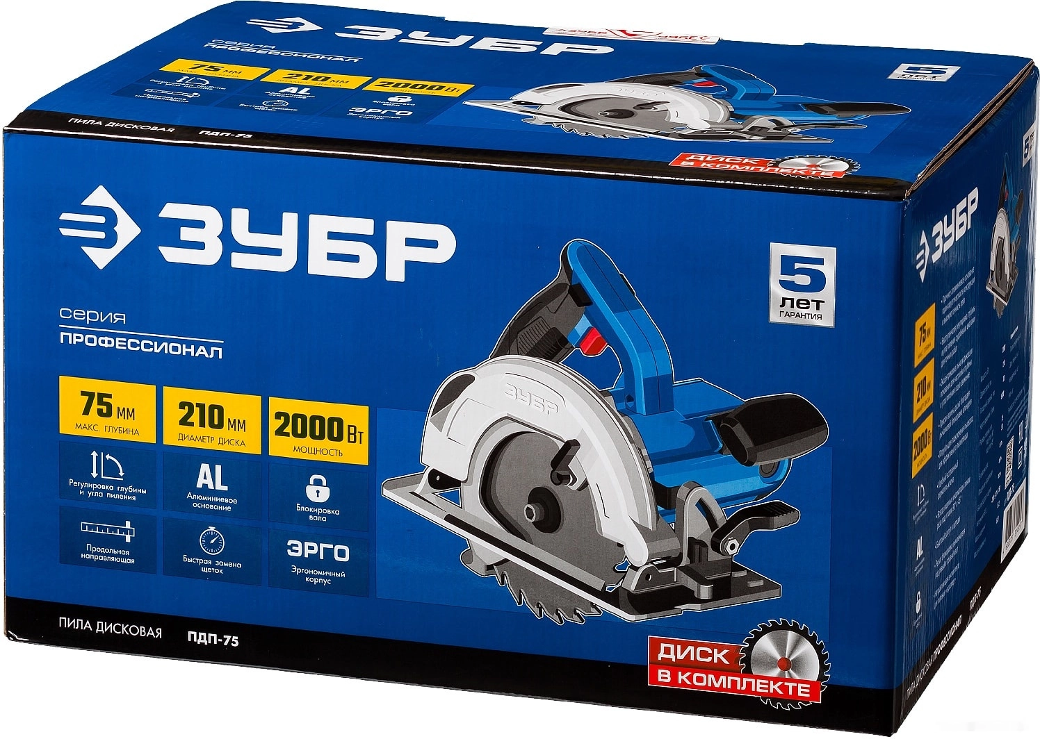 ХарактеристикиАртикул ПДП-75Бренды ЗубрСтрана производства КитайТип дисковаяПотребляемая мощность 2000Число оборотов холостого хода 5300Посадочный диаметр 30Диаметр диска 210Длина сетевого шнура 3Кейс в комплекте нетВес 5.2Питание сетьМощность 2000Скорость вращения шпинделя 5300Регулировка скорости распила нетУгол наклона диска 45Длина 385Подключение к пылесосу естьШирина 280Высота 290Глубина реза 90° 75Глубина реза 45° 50Плавный пуск естьЛазерный маркер нетПылесборник нетПодсветка нетОписание товара обновлено 28.01.2026 16:57:19Серия профессионального инструмента ЗУБР пополнилась новыми моделями циркулярных пил для всех видов распиловочных работ.Выверенная эргономика в сочетании с отработанной конструкцией позволяют предложить Вам лучший баланс характеристик и удобства