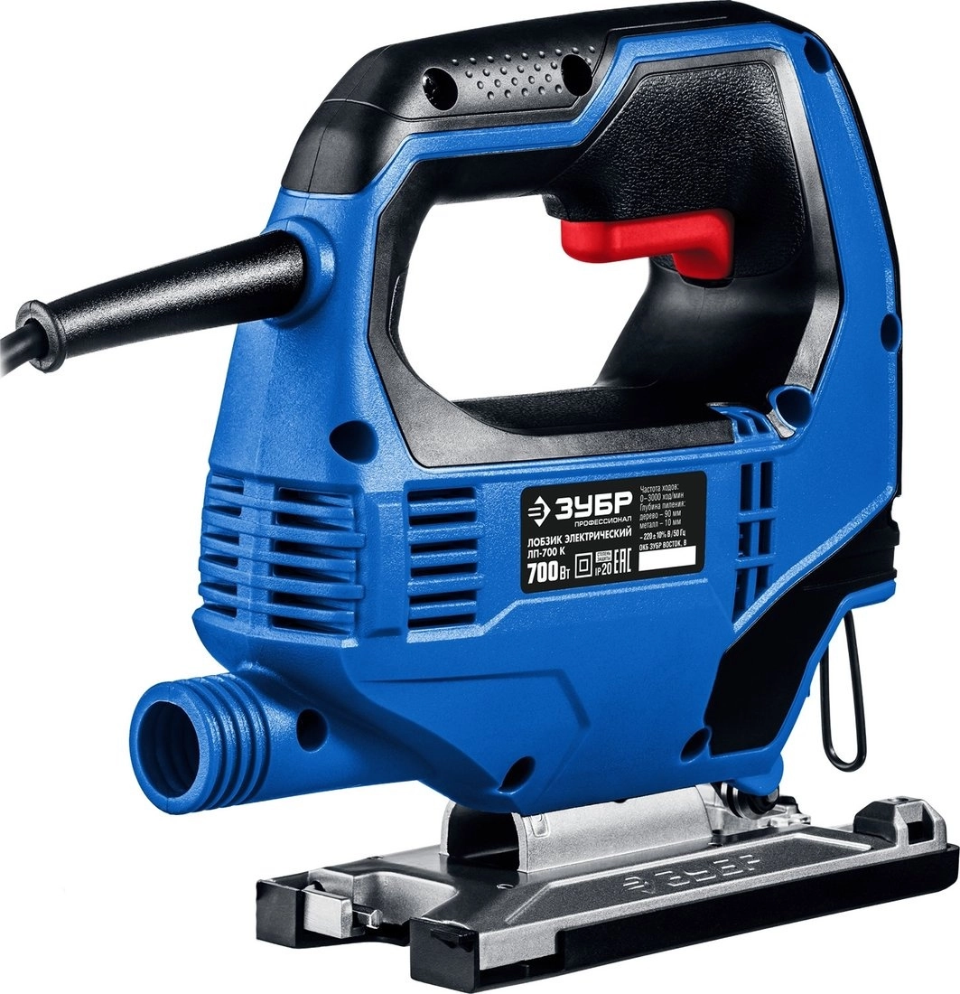 ХарактеристикиАртикул ЛП-700 КБренды ЗубрСтрана производства КитайПотребляемая мощность 700Число оборотов холостого хода 3000Глубина пропила дерева, мм 90Глубина пропила стали, мм 10Длина сетевого шнура 3Кейс в комплекте естьПодсветка рабочей зоны естьВес 2.6Питание сетьТип корпуса рукоятка-скобаГлубина пропила (дерево) 90Глубина пропила (сталь) 10Глубина пропила (цветные металлы) 20Частота ходов 3000Амплитуда хода пилки 23Режим маятникого хода естьРегулировка частоты хода естьАвтоматический сдув опилок естьПодключение к пылесосу естьСистема быстрой замены пилок естьЛазерный маркер нетСтолик для крепления на рабочем месте нетЗащитные пластины нетКоличество пилок 1Кейс естьКомплектации ключЗащита от непреднамеренного включения ДаОписание набора Лобзик; - Накладка на основание; - Вставка для чистого пиления; - Ключ имбусовый; - Полотно; - Кейс; - Руководство по эксплуатации.Защитный щиток НетРегулировка оборотов ДаОписание товара обновлено 08.12.2025 14:53:59Лобзик электрический ЗУБР ЛП-700 К, предназначен для всех видов пиления (прямого, наклонного, криволинейного) различных материалов. Профессиональная конструкция для наиболее качественного результата. Мощный двигатель с медной обмоткой имеет высокую перегрузочную способность. Высокая точность конструкции обеспечивает отсутствие люфтов, что способствует высокому качеству пиления. Быстрозажимной пилкодержатель для Т-образных хвостовиков полотен. Электронная регулировка частоты хода позволяет выбрать наилучший режим работы для любого материала. 3-позиционный маятниковый ход для обеспечения как быстрого, так и чистого пиления. Удобная эргономичная рукоятка для крепкого хвата и комфортного управления. Переключение между обдувом зоны реза и отводом опилок в пылесос обеспечивает контроль линии пиления или чистоту рабочего места. Патрубок подключения пылесоса снижает запыленность при пилении. Литая подошва с регулировкой угла пропила ±45 градусов с возможностью установки направляющего упора. КОМПЛЕКТАЦИЯ: