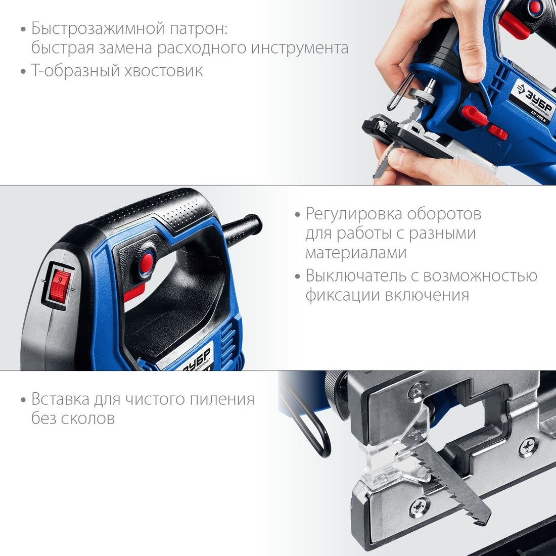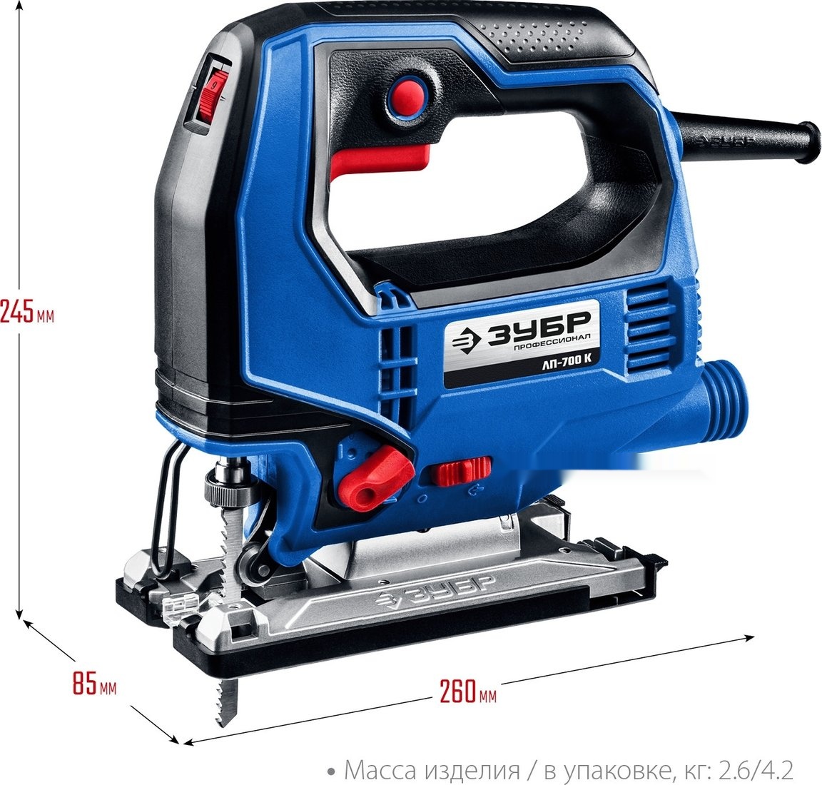 ХарактеристикиАртикул ЛП-700 КБренды ЗубрСтрана производства КитайПотребляемая мощность 700Число оборотов холостого хода 3000Глубина пропила дерева, мм 90Глубина пропила стали, мм 10Длина сетевого шнура 3Кейс в комплекте естьПодсветка рабочей зоны естьВес 2.6Питание сетьТип корпуса рукоятка-скобаГлубина пропила (дерево) 90Глубина пропила (сталь) 10Глубина пропила (цветные металлы) 20Частота ходов 3000Амплитуда хода пилки 23Режим маятникого хода естьРегулировка частоты хода естьАвтоматический сдув опилок естьПодключение к пылесосу естьСистема быстрой замены пилок естьЛазерный маркер нетСтолик для крепления на рабочем месте нетЗащитные пластины нетКоличество пилок 1Кейс естьКомплектации ключЗащита от непреднамеренного включения ДаОписание набора Лобзик; - Накладка на основание; - Вставка для чистого пиления; - Ключ имбусовый; - Полотно; - Кейс; - Руководство по эксплуатации.Защитный щиток НетРегулировка оборотов ДаОписание товара обновлено 08.12.2025 14:53:59Лобзик электрический ЗУБР ЛП-700 К, предназначен для всех видов пиления (прямого, наклонного, криволинейного) различных материалов. Профессиональная конструкция для наиболее качественного результата. Мощный двигатель с медной обмоткой имеет высокую перегрузочную способность. Высокая точность конструкции обеспечивает отсутствие люфтов, что способствует высокому качеству пиления. Быстрозажимной пилкодержатель для Т-образных хвостовиков полотен. Электронная регулировка частоты хода позволяет выбрать наилучший режим работы для любого материала. 3-позиционный маятниковый ход для обеспечения как быстрого, так и чистого пиления. Удобная эргономичная рукоятка для крепкого хвата и комфортного управления. Переключение между обдувом зоны реза и отводом опилок в пылесос обеспечивает контроль линии пиления или чистоту рабочего места. Патрубок подключения пылесоса снижает запыленность при пилении. Литая подошва с регулировкой угла пропила ±45 градусов с возможностью установки направляющего упора. КОМПЛЕКТАЦИЯ: