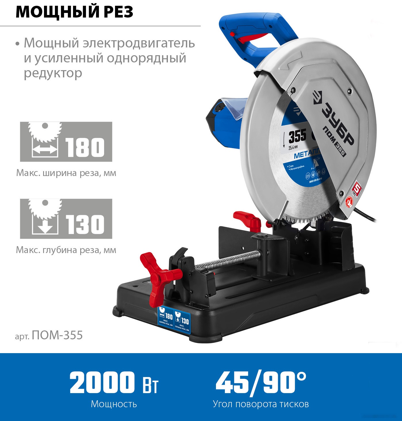 ХарактеристикиАртикул ПОМ-355Бренды ЗубрСтрана производства КитайПотребляемая мощность 2000Число оборотов холостого хода 1500Диаметр пильного диска, мм 355Диам. отверстия пильного диска, мм 25.40Посадочный диаметр 25.4Диаметр диска 355Длина сетевого шнура 2Кейс в комплекте нетВес 22.5Питание сетьСкорость вращения шпинделя 1500Регулировка скорости распила нетКоличество скоростей распила 1Угол наклона диска 45Длина 670Подключение к пылесосу нетШирина 350Высота 640Глубина реза 90° 130Глубина реза 45° 105Лазерный маркер естьПодсветка нетШирина пропила 180Описание товара обновлено 08.12.2025 13:32:54ПОМ-355 Профессиональная отрезная пила для пильных дисков по металлу. Диск с твердосплавными пластинами (в комплект не входит), позволяет получить стабильный производительный рез высокого качества, с минимальным количеством искр, без заусенцев и окалин.